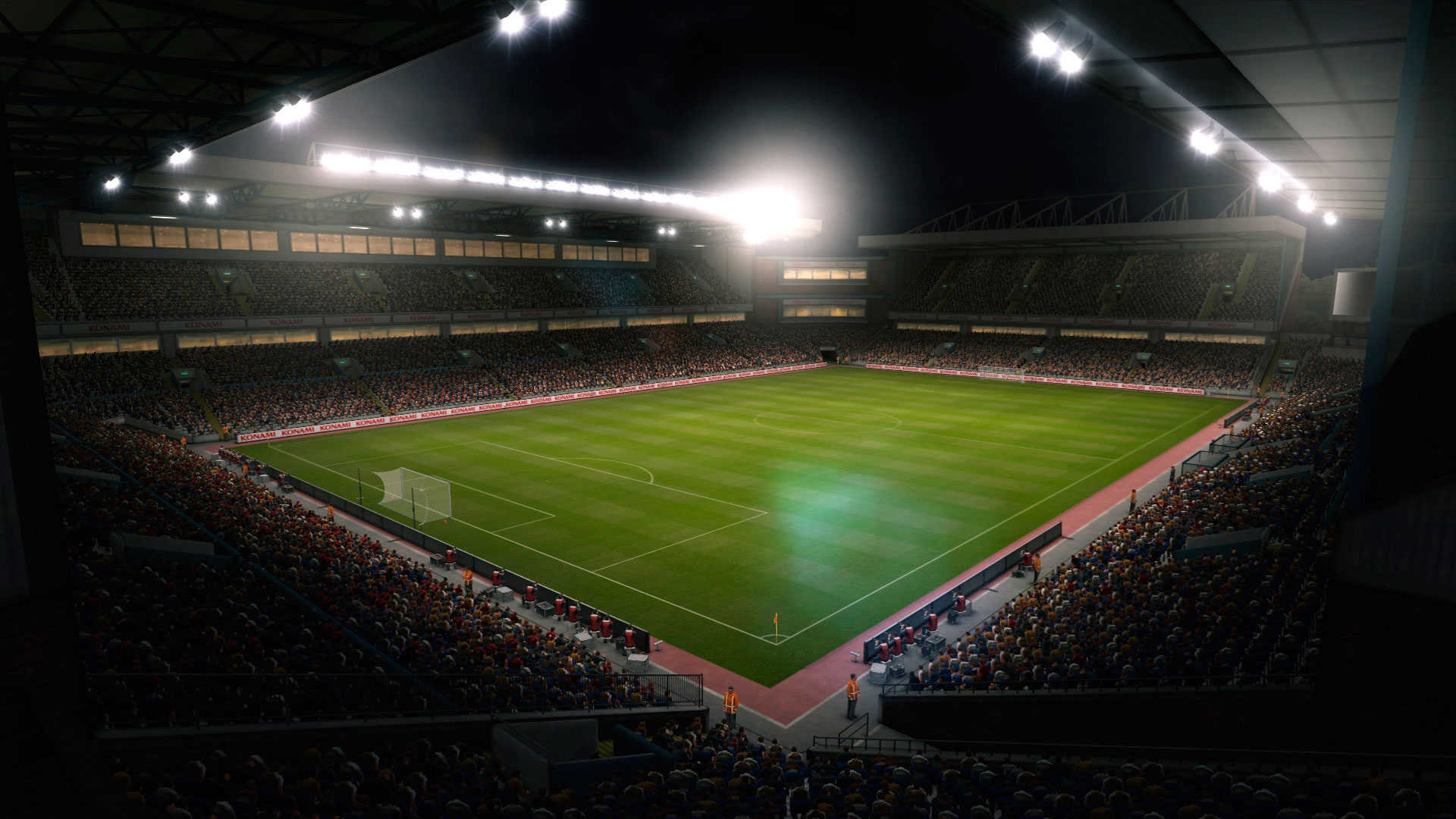 Description: A stadium with a large green field and a lot of people watching it at night time with bright lights.