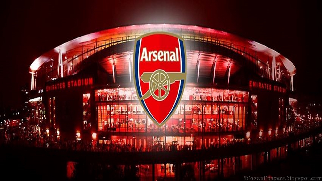 Description: A stadium with a red and blue logo on it's side at night time with lights on the side.