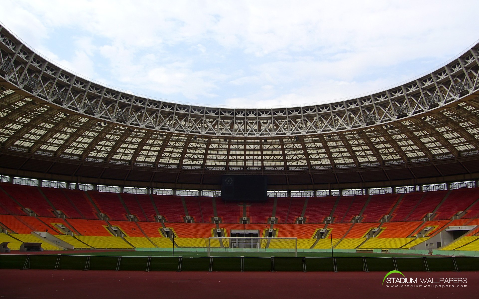Description: A large stadium with a sky background and a green field in the middle of the stadium area with a yellow and red field.