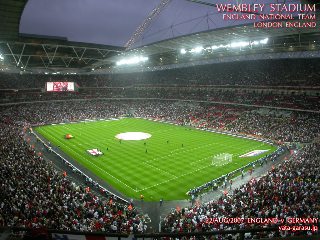 Description: A stadium full of people watching a soccer match at night with a large field in the middle of the stadium.