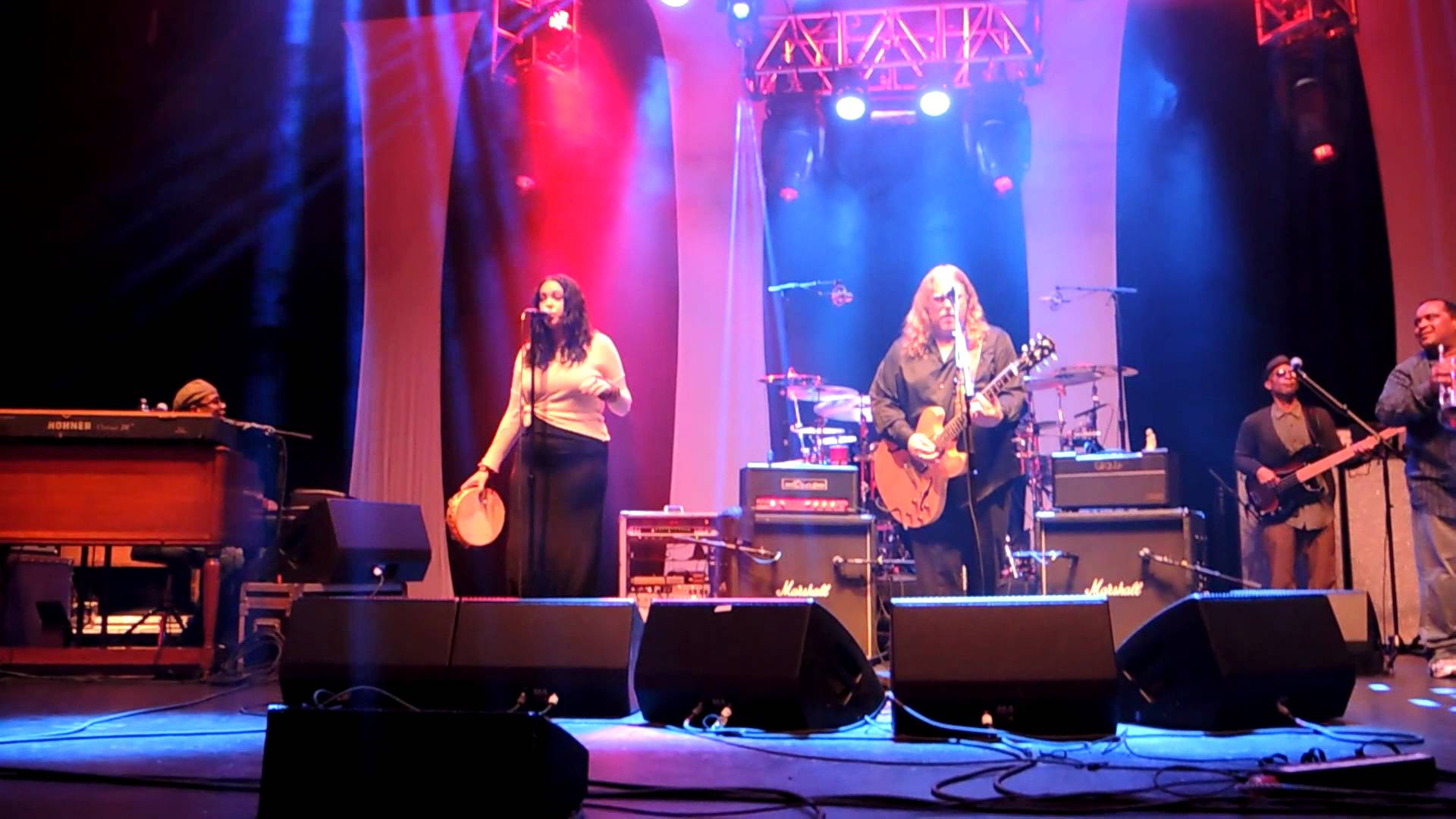 Description: A group of people on stage playing instruments and singing on a stage with lights on and a piano in the background.