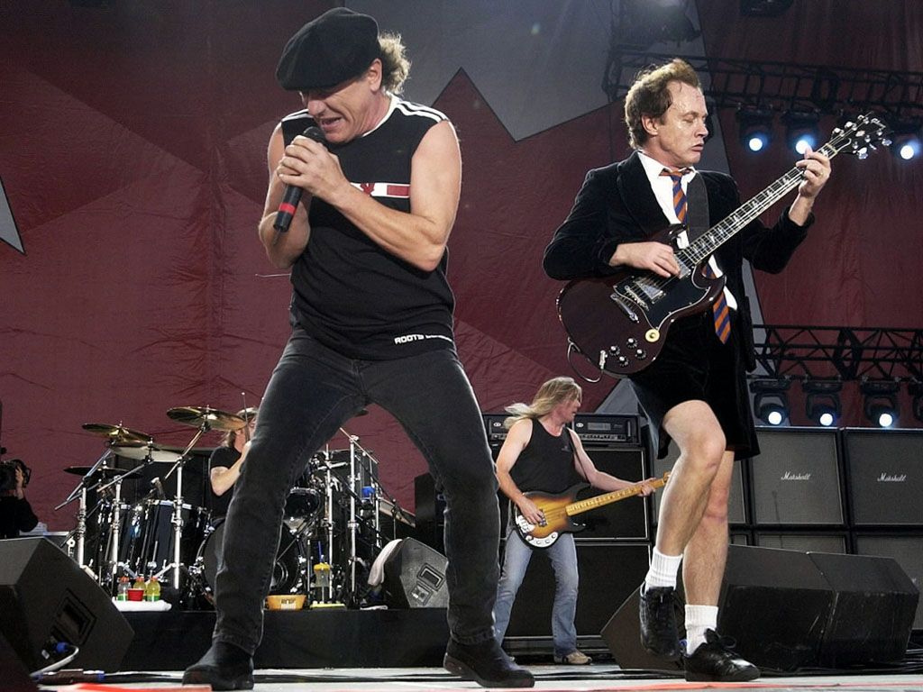 Description: Two men are performing on stage with guitars and bass guitars in their hands and a woman in a black dress.
