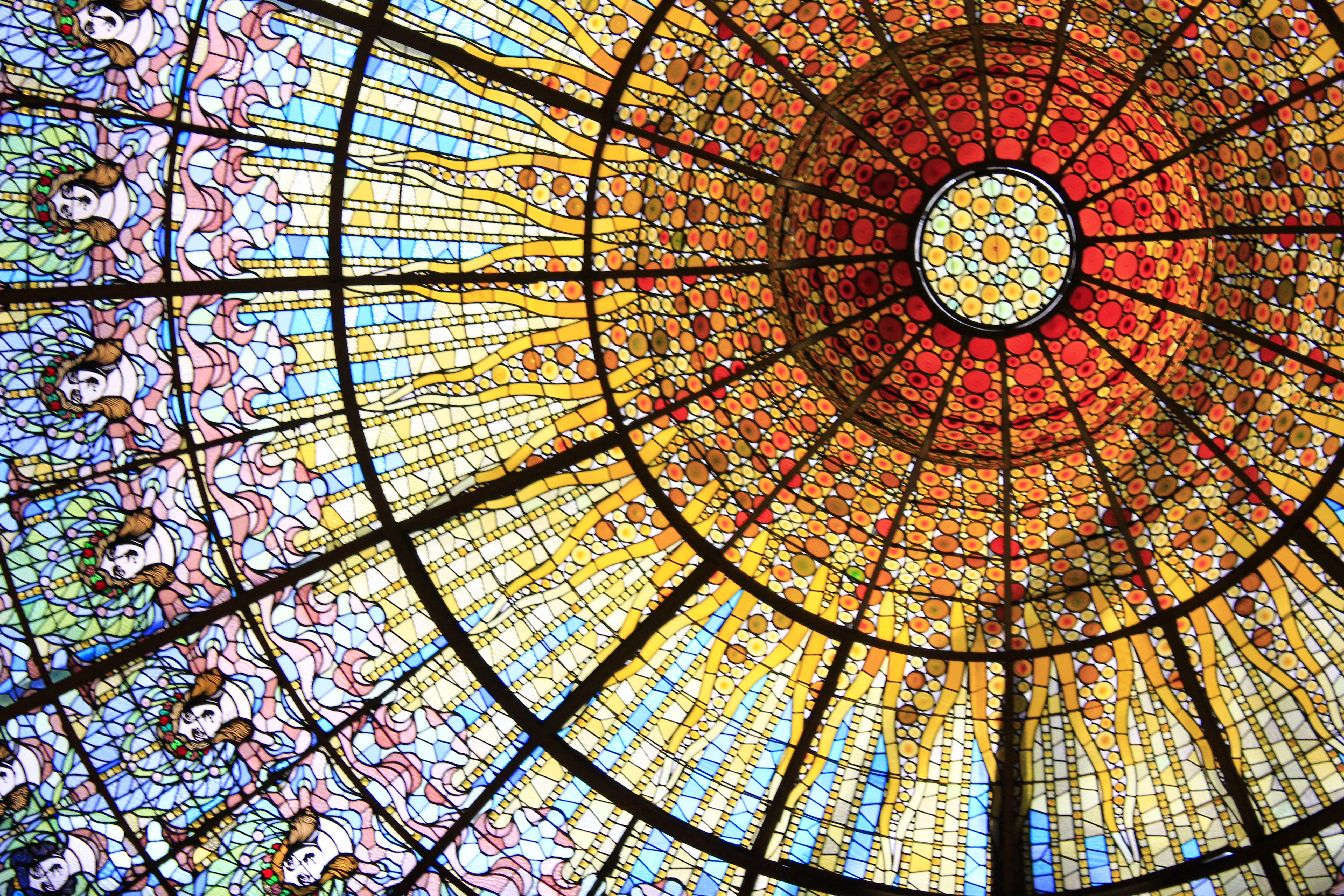 Description: A large stained glass dome with a circular window in the center of it.