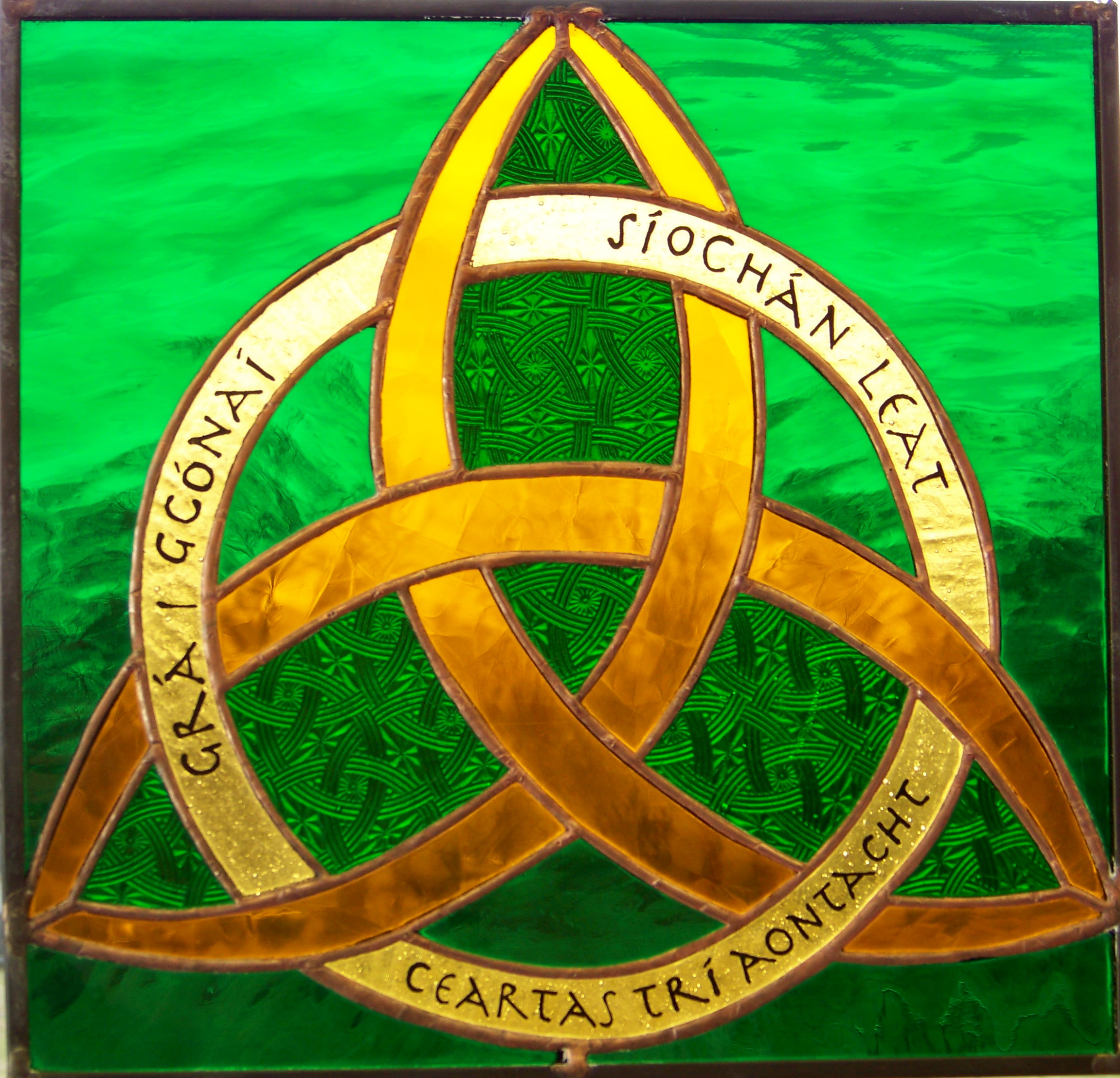 Description: A stained glass window with a golden and green design on it's side and a green background with a gold border.