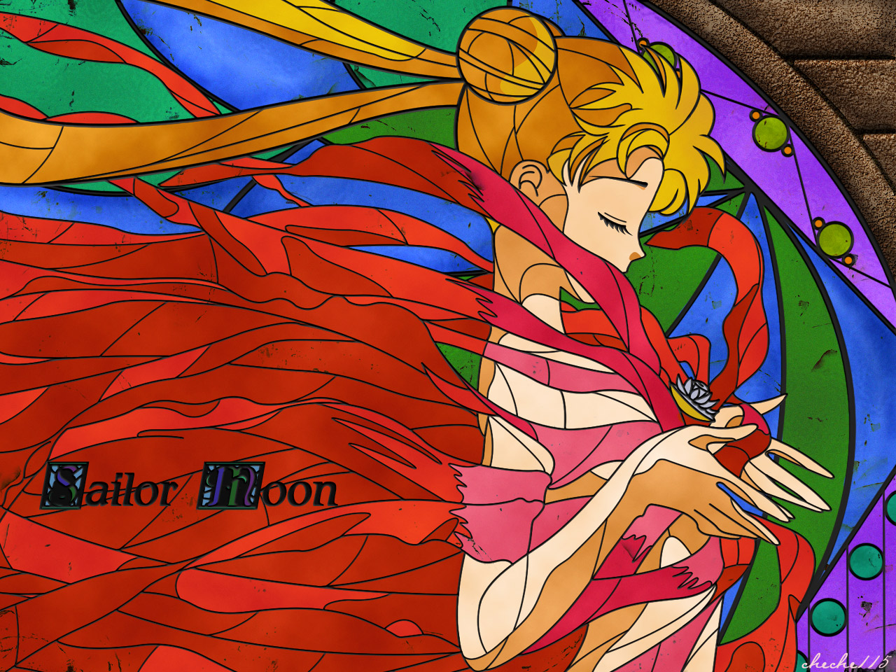 Description: A stained glass window with a woman in a red dress and a bird on her shoulder and a name on the glass.