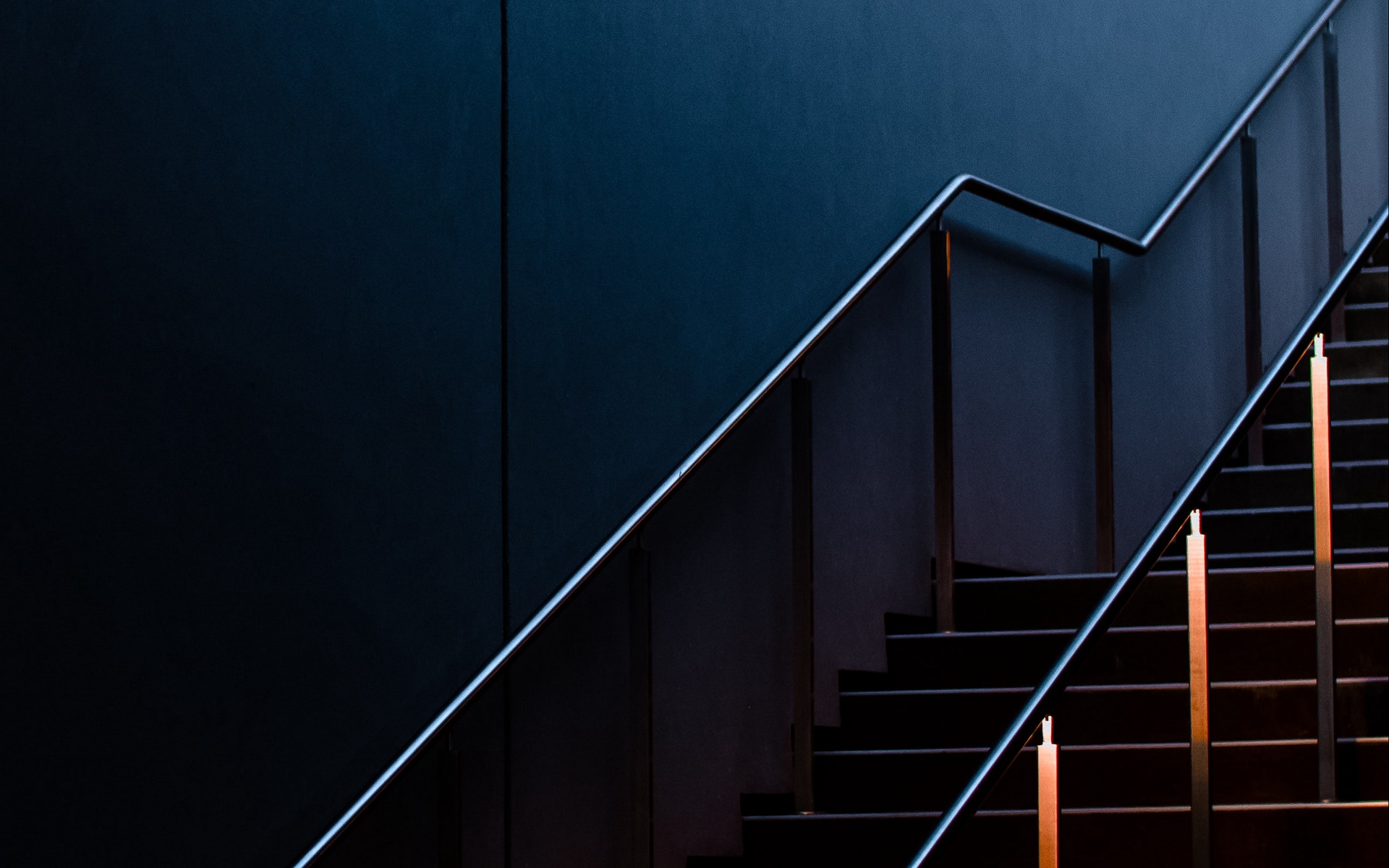 Description: A stair case with a clock on the side of it and a clock on the wall above it and a clock on the wall.