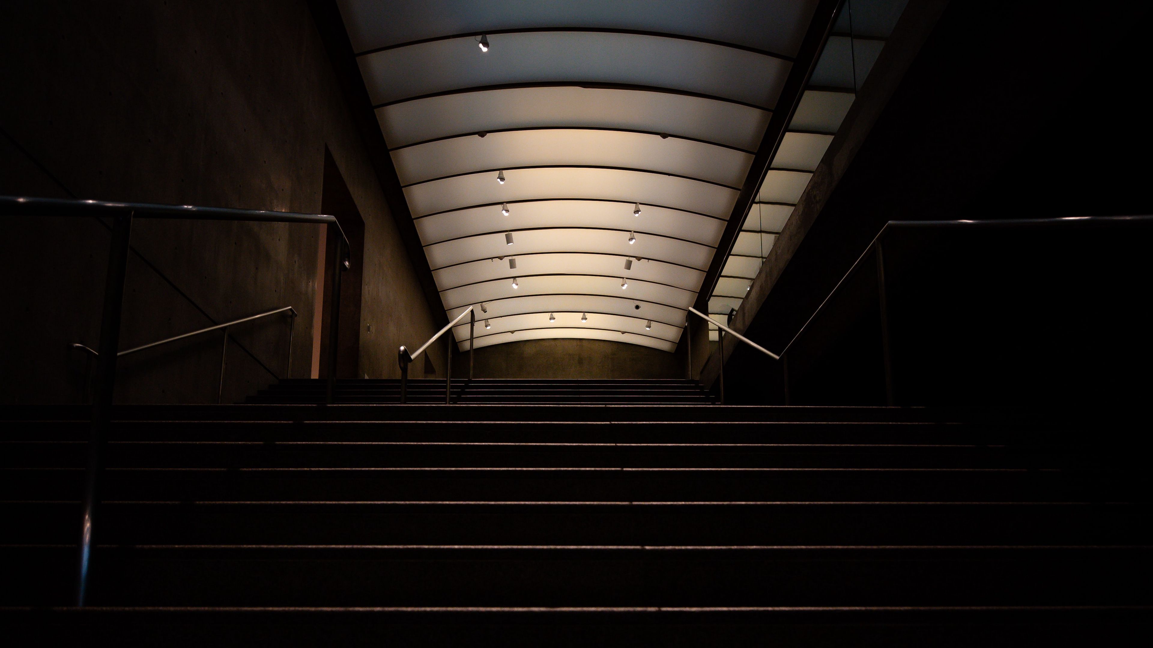 Description: A set of stairs leading up to a light filled ceiling in a building with a metal hand rail and railing.