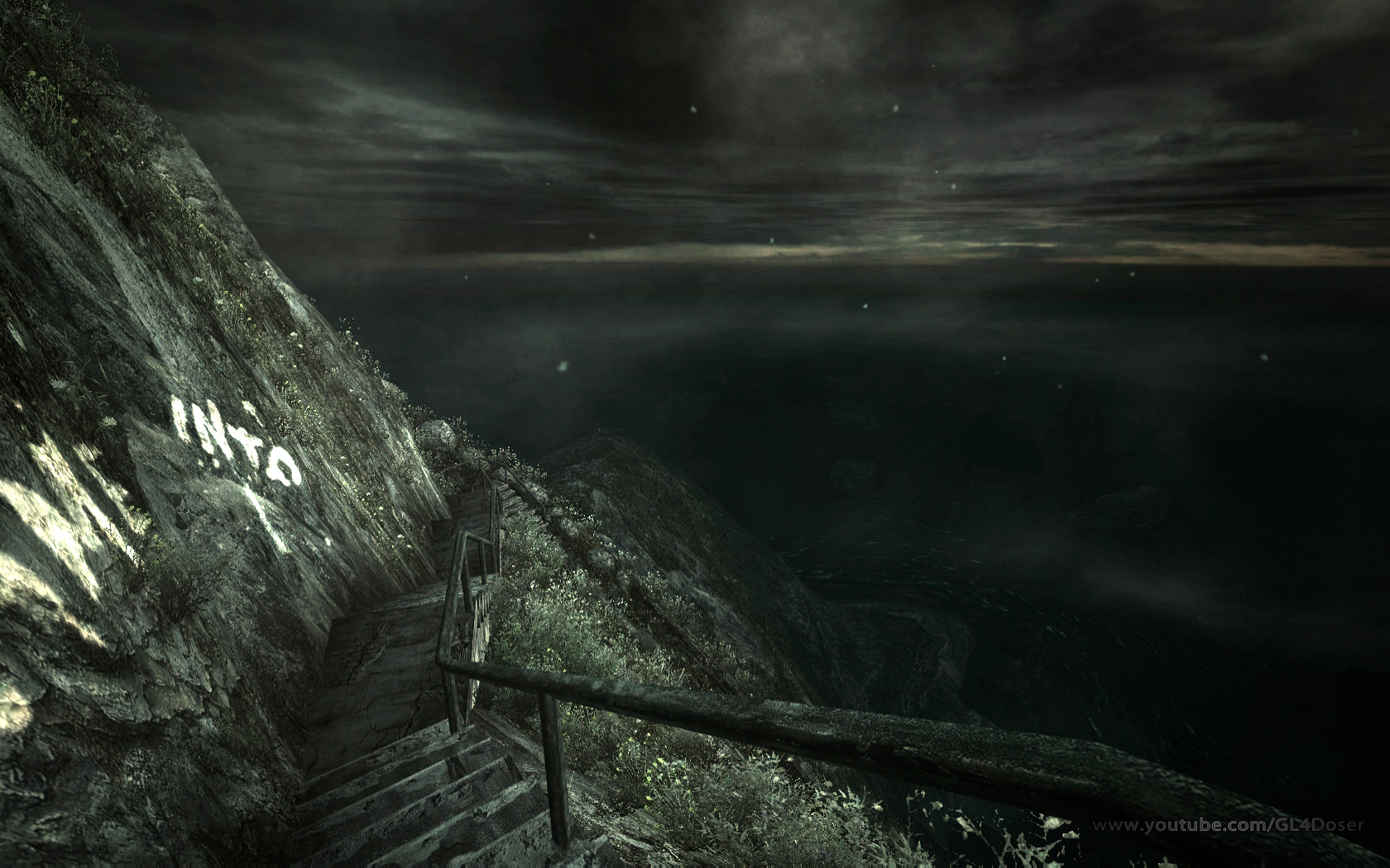 Description: A stairway leading to a cave with a sign on it that says stay out of the water below it.