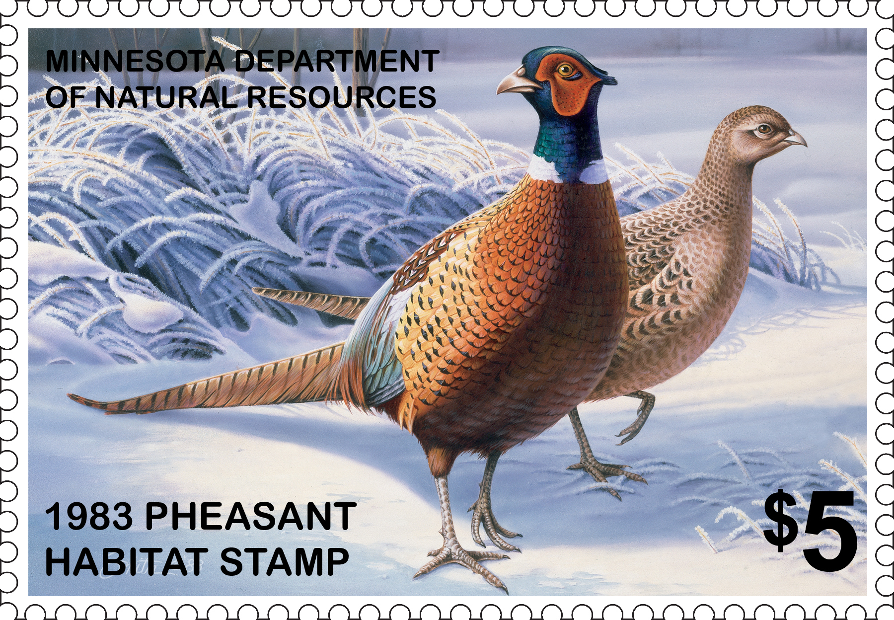 Description: A stamp with two birds on it and a snowy landscape behind it with the words minnesota department of natural resources.