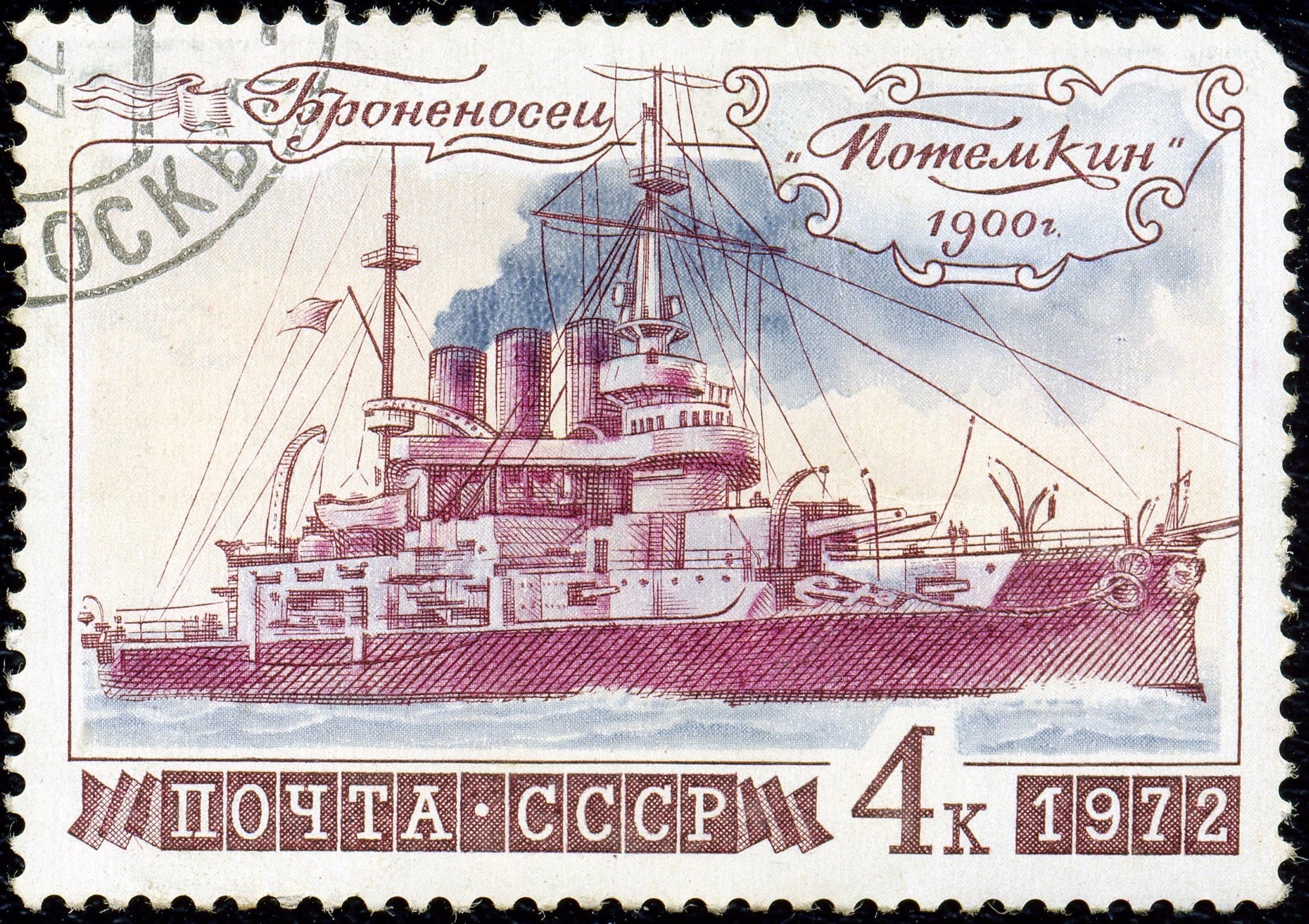 Description: A stamp with a ship on it and a caption for the russian navy on it.