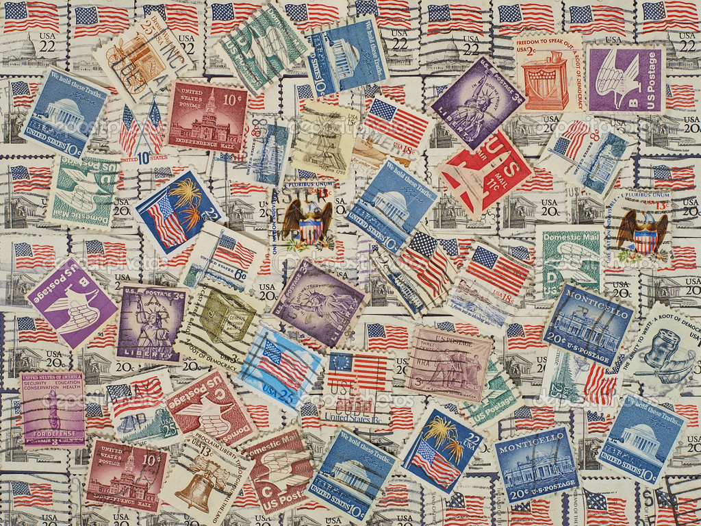 Description: A large pile of stamps on a wallpaper covered in stamps and flags of different colors and sizes and shapes.