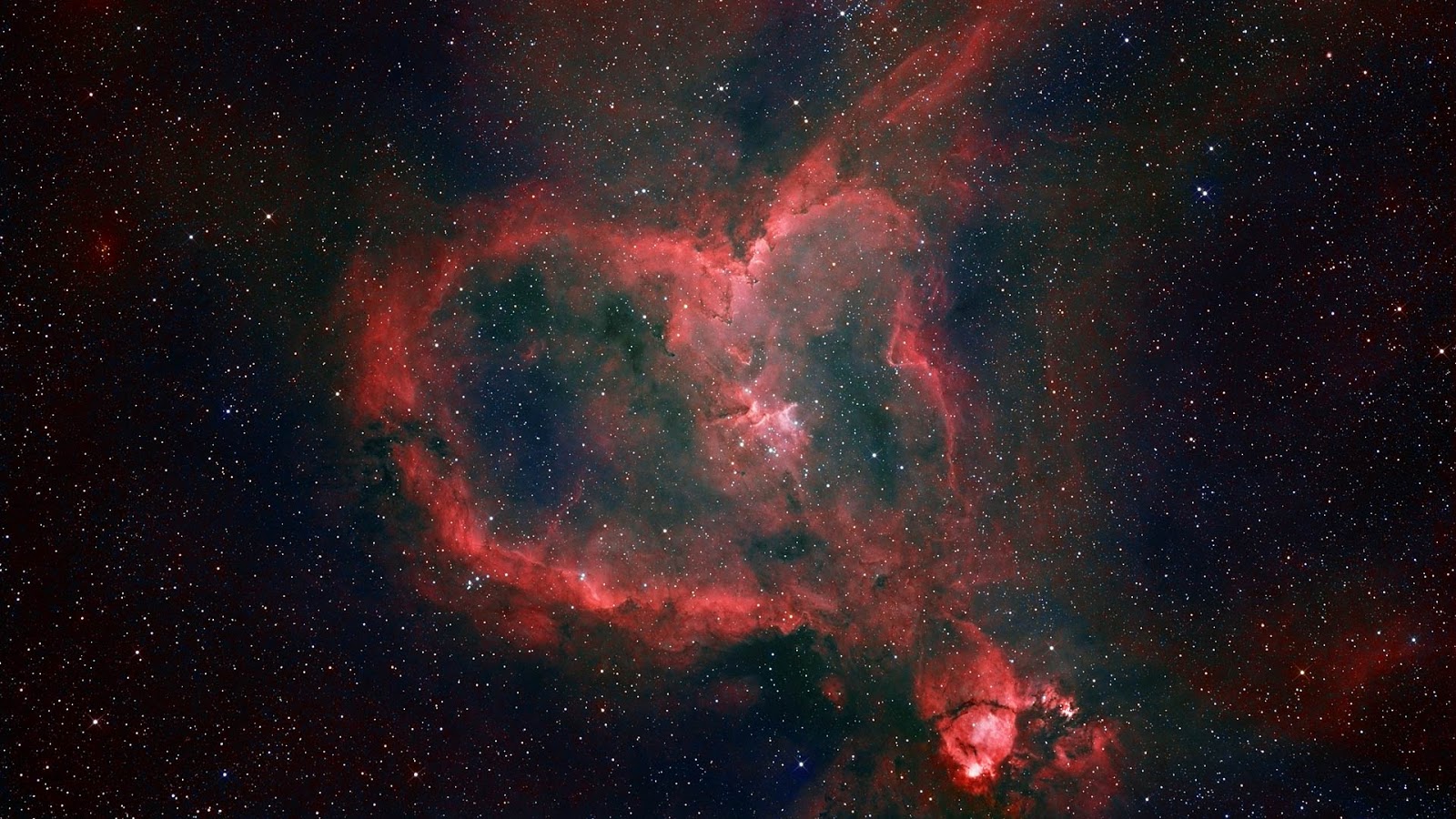 Description: A large star cluster in the sky with stars around it and a red heart shaped object in the center.