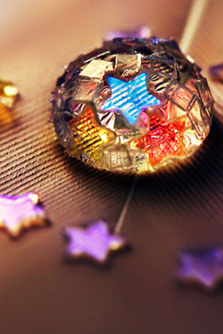 Description: A star shaped candy bar sitting on top of a table next to other candies and stars of different colors.