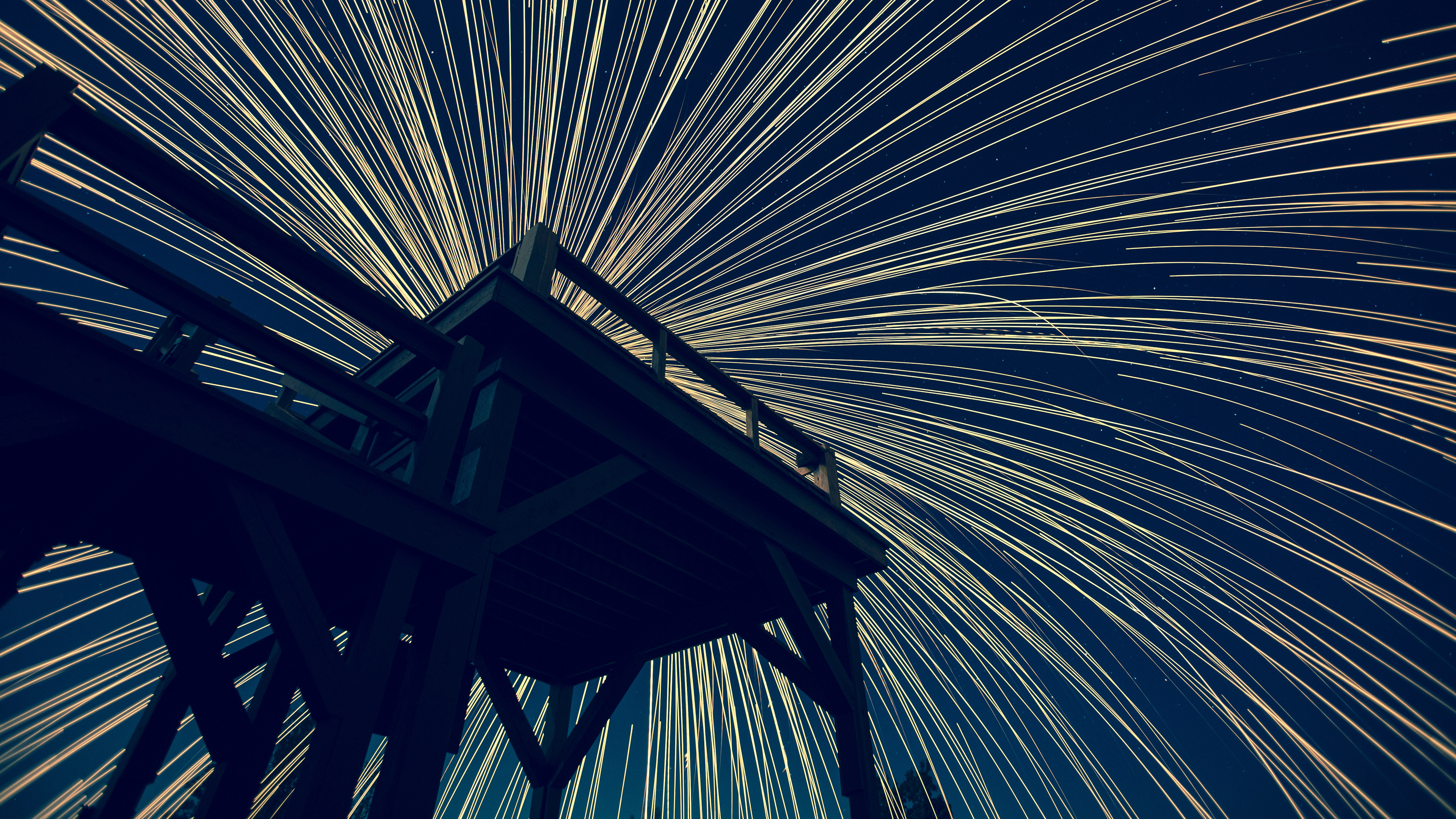 Description: A star trail is seen in the sky above a building and a clock tower in the foreground of the image.
