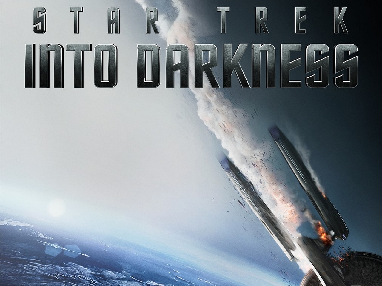 Description: A movie poster for star trek into darkness with a space ship in the background and smoke billowing out of the clouds.