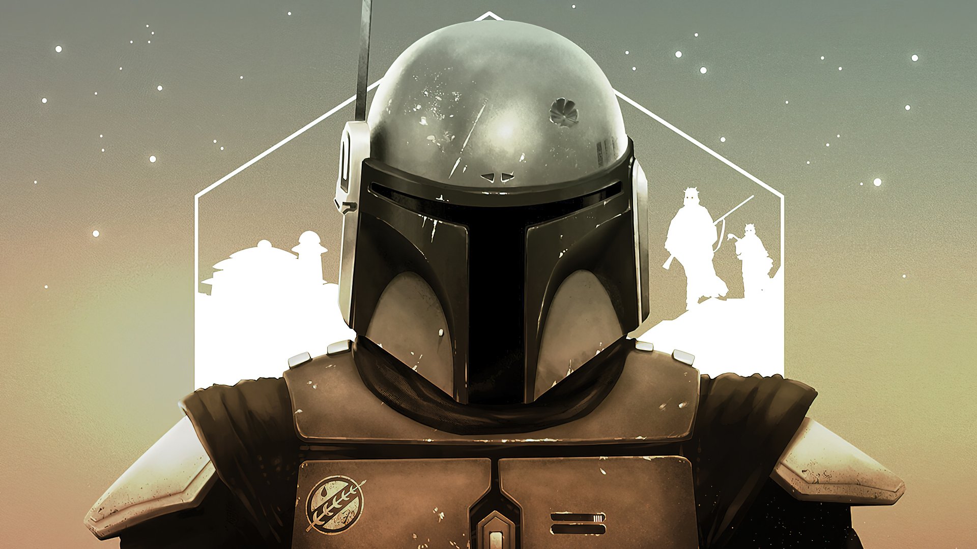 Description: A star wars poster with a boba fett helmet on it's head and a group of people in the background.
