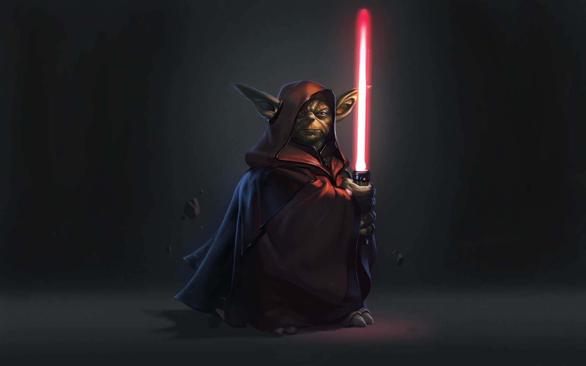 Description: A character in a star wars costume holding a light saber in his hand and a dark background with a bit of light coming from the light.