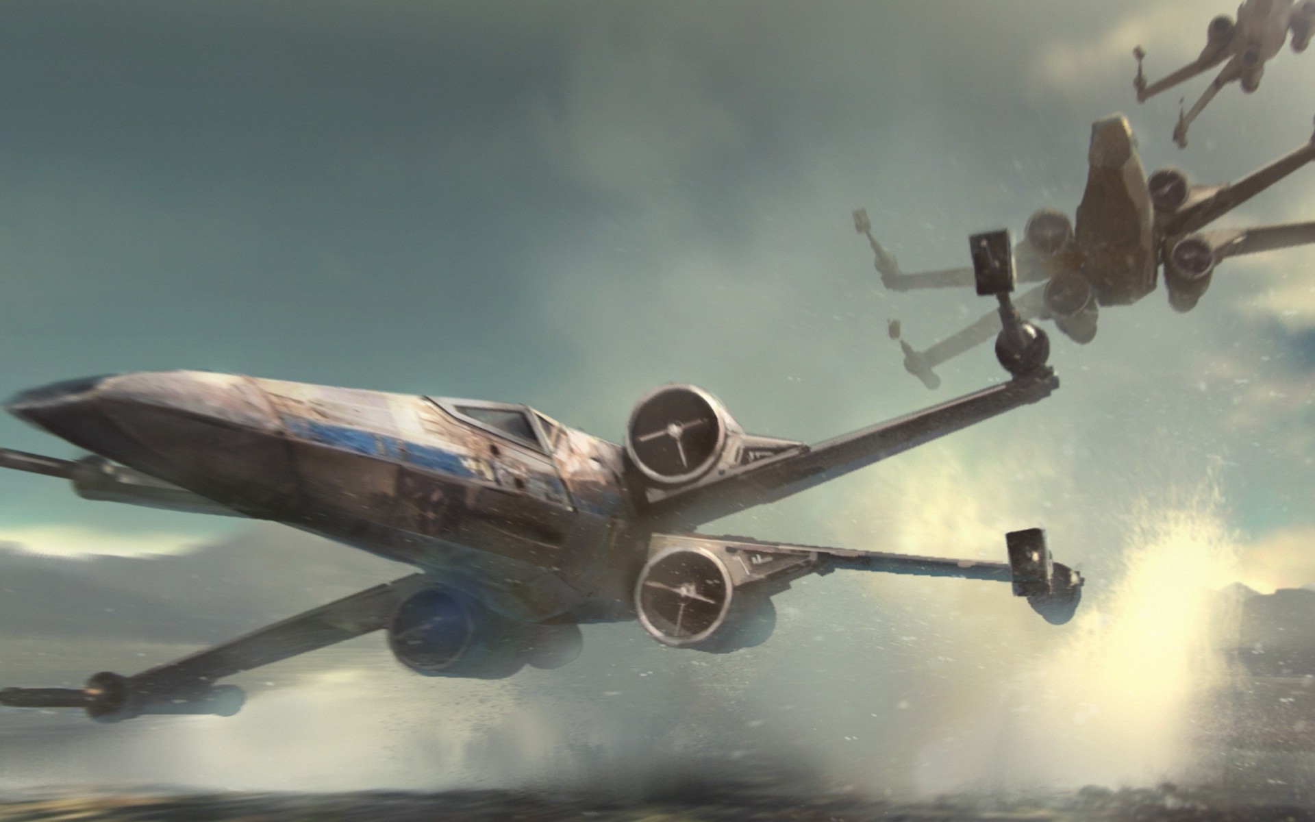 Description: A star wars scene with a fighter jet and a fighter jet in the air with smoke coming out of the back.