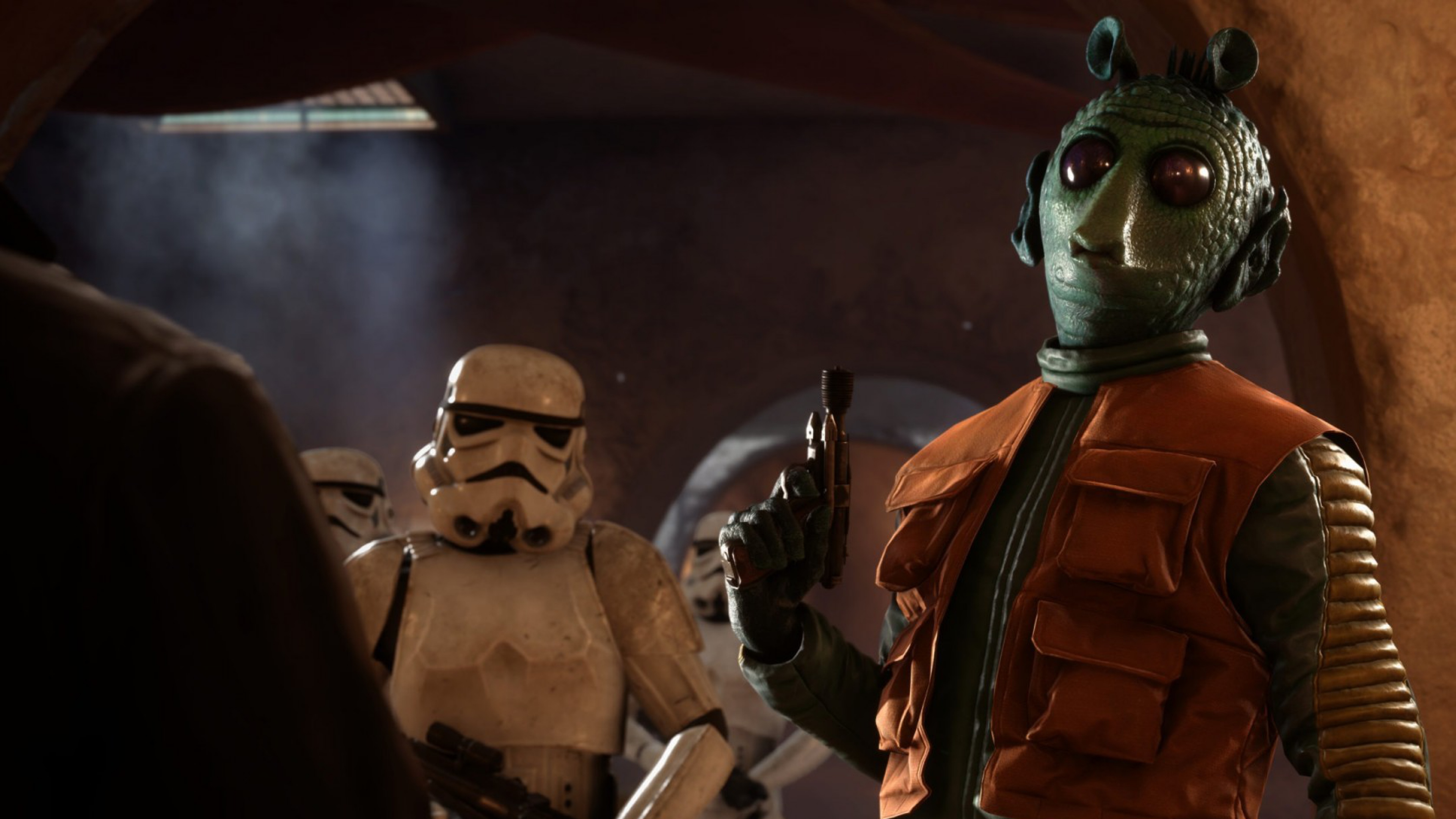 Description: A scene from star wars with a group of characters in costume and weapons.