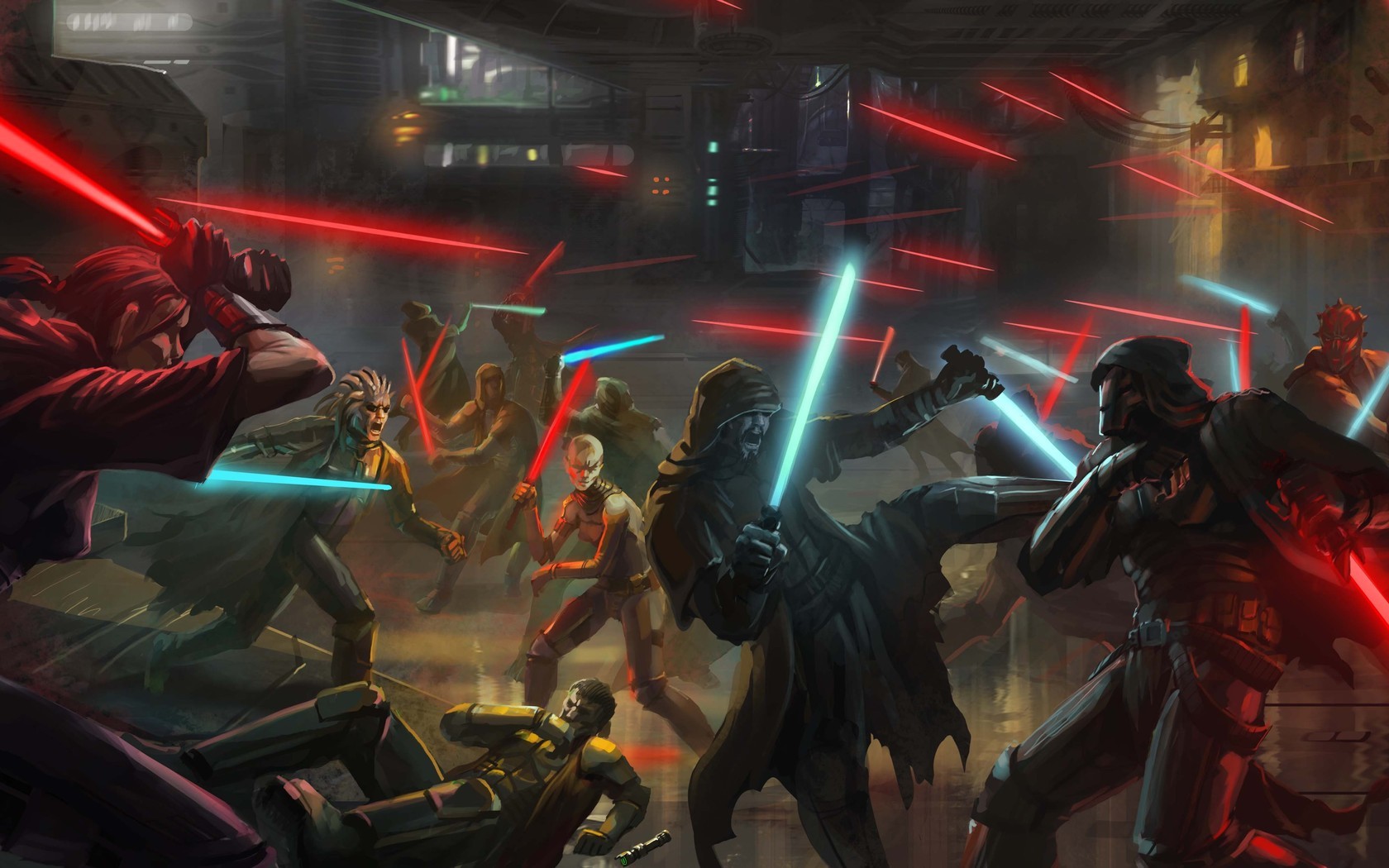 Description: A group of people in a dark room with lightsabed in the background and a star wars scene in the foreground.