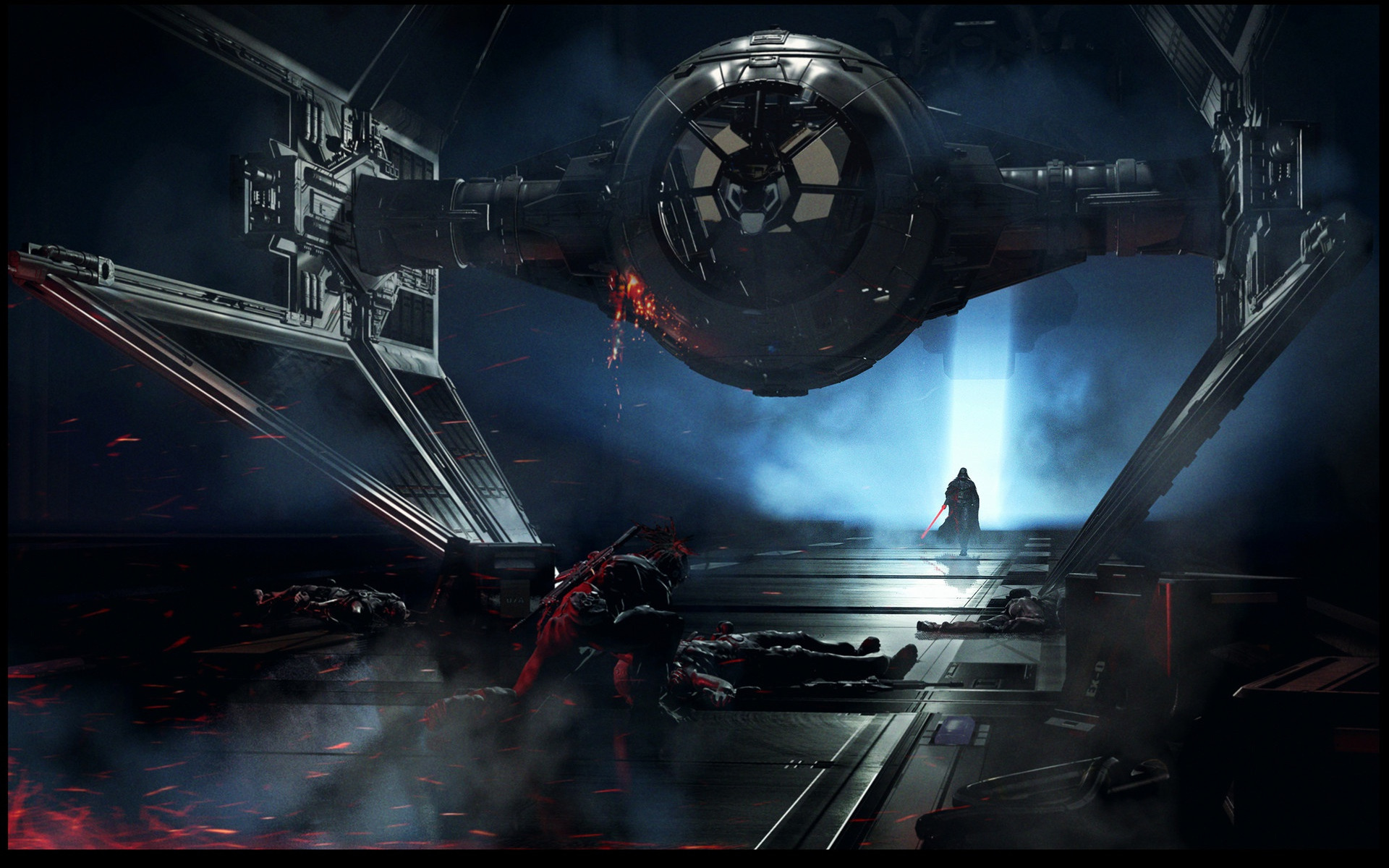 Description: A scene from star wars the old republic with a man standing in front of a millennium falcon in the background.