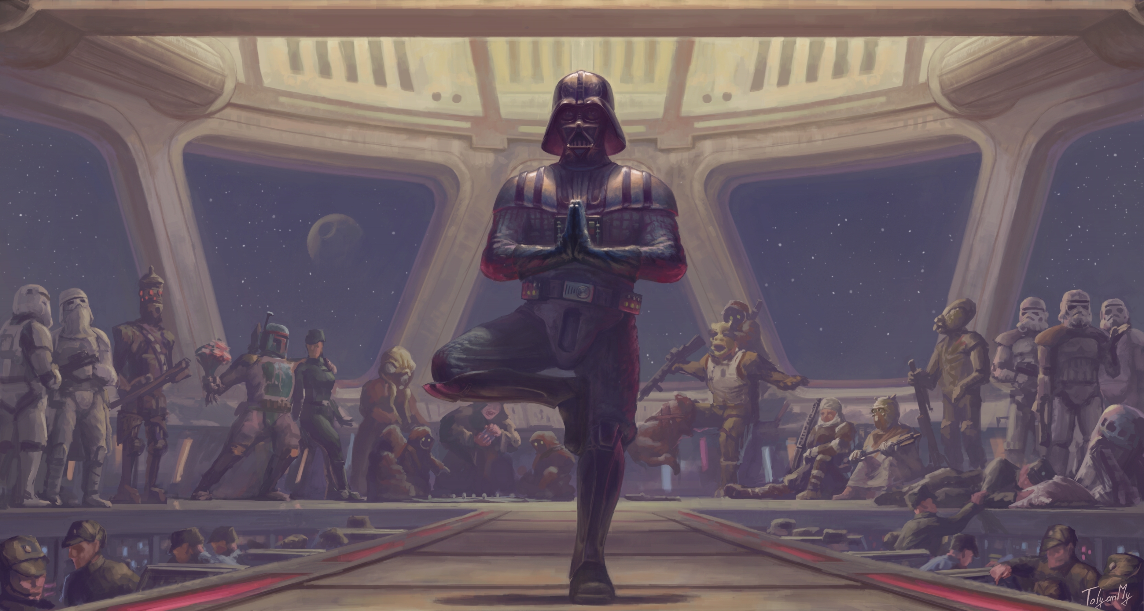 Description: A scene from star wars the old republic with a man in a star wars costume standing in front of a crowd of people.