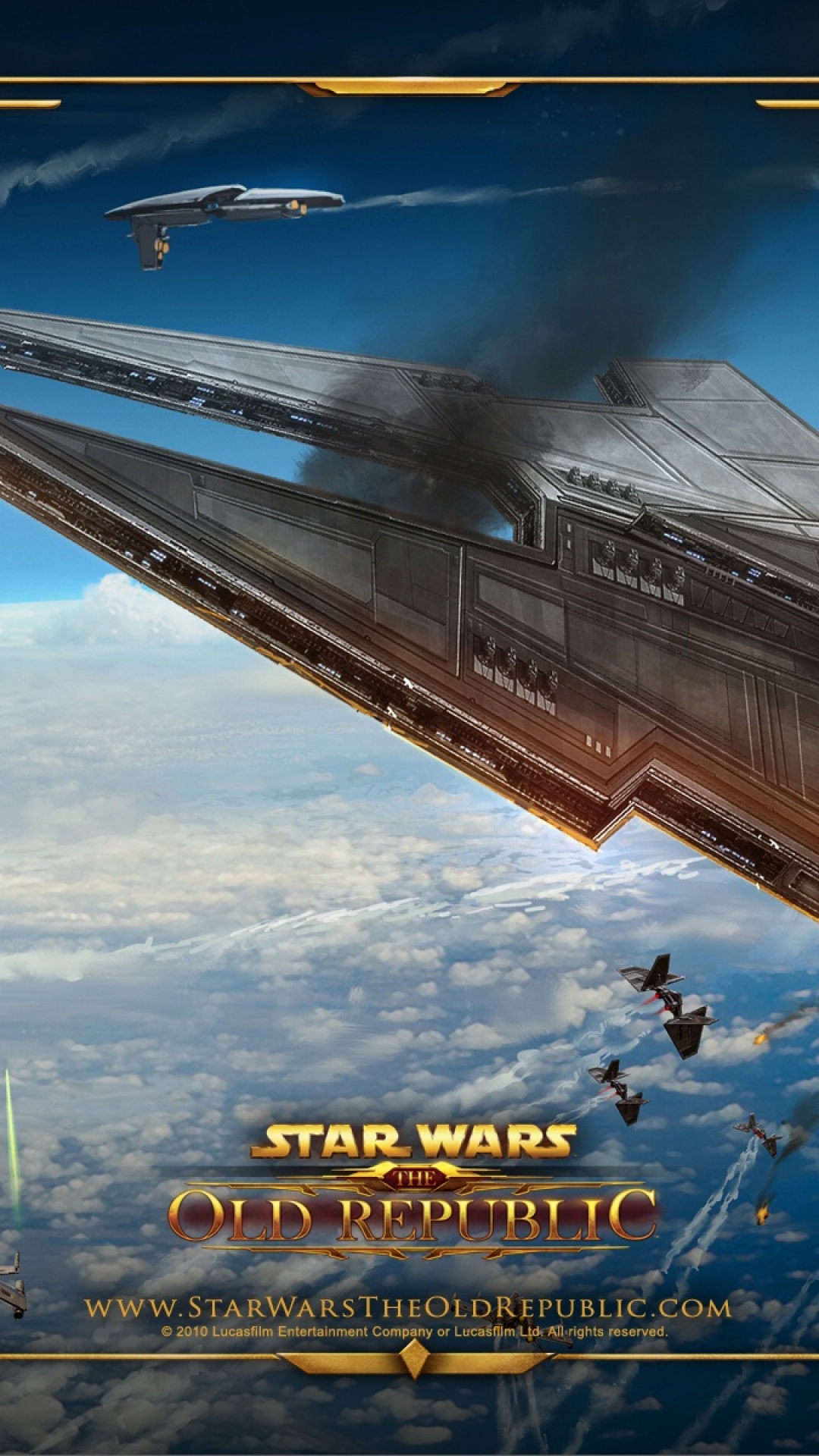 Description: A star wars poster with a large ship in the sky and a fleet of fighter jets flying over the earth.