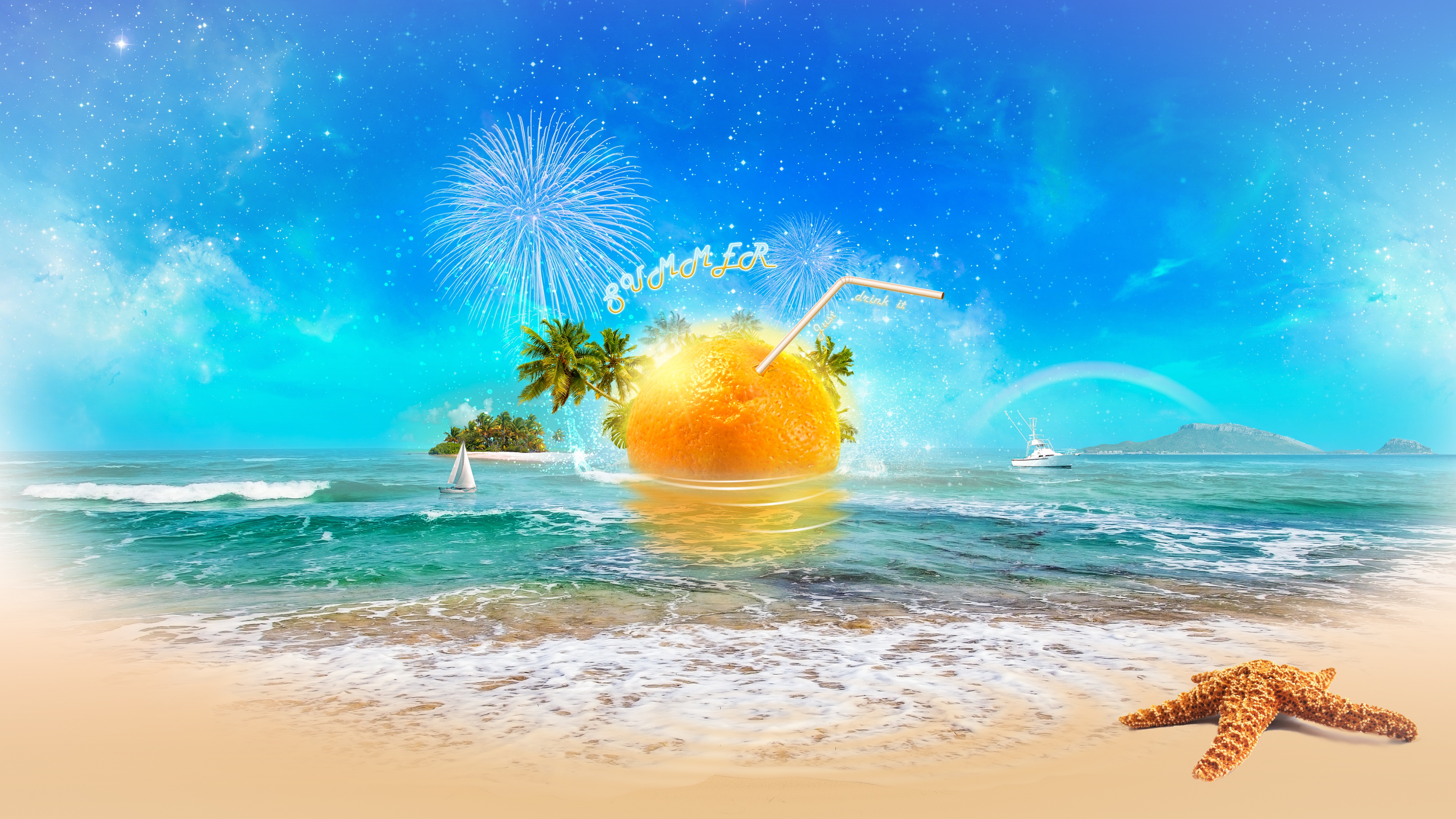 Description: A starfish and a beach ball on a beach with a starfish in the water and a beach with a starfish.