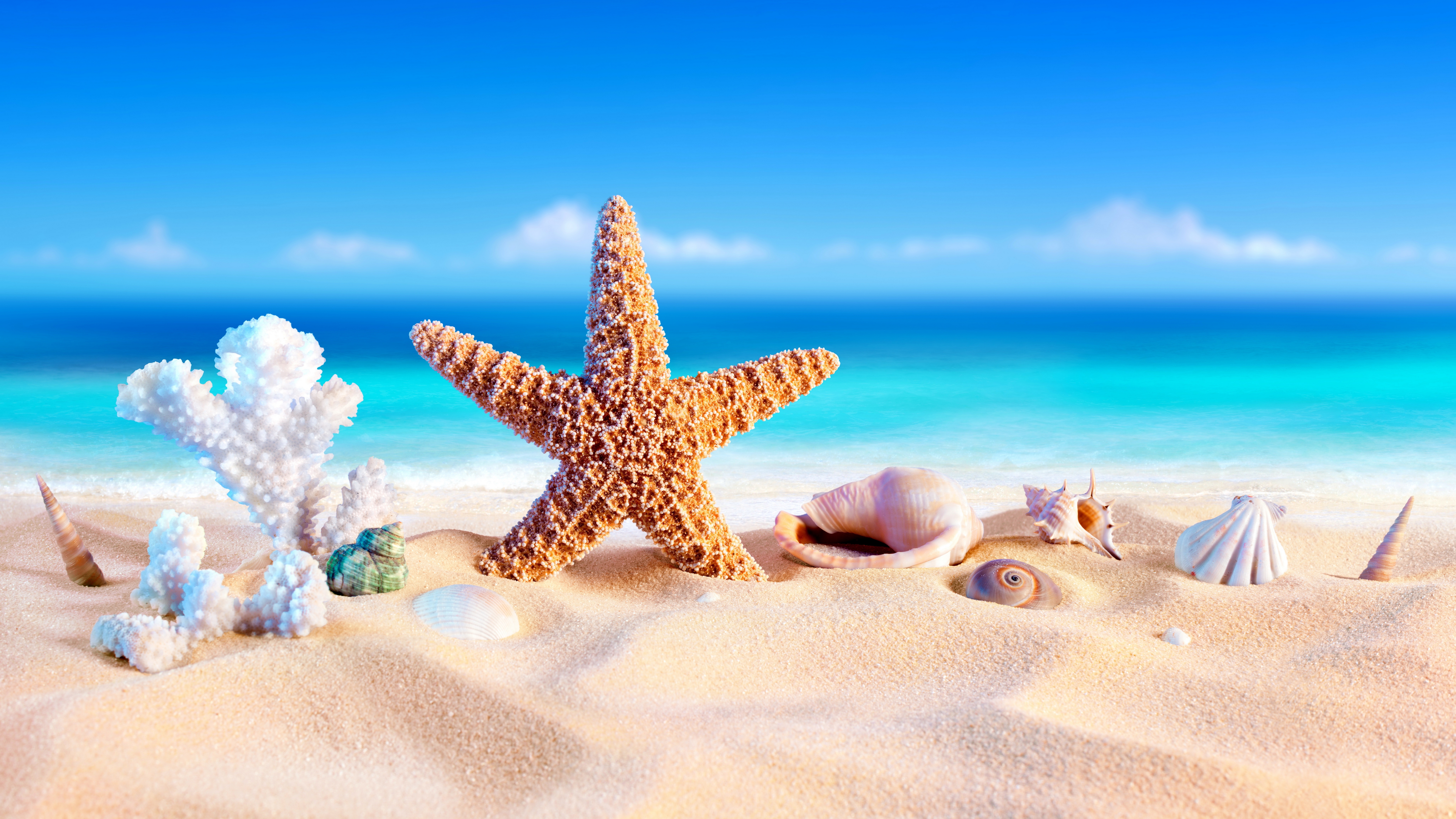 Description: A starfish and shells on a sandy beach with a blue ocean in the background.