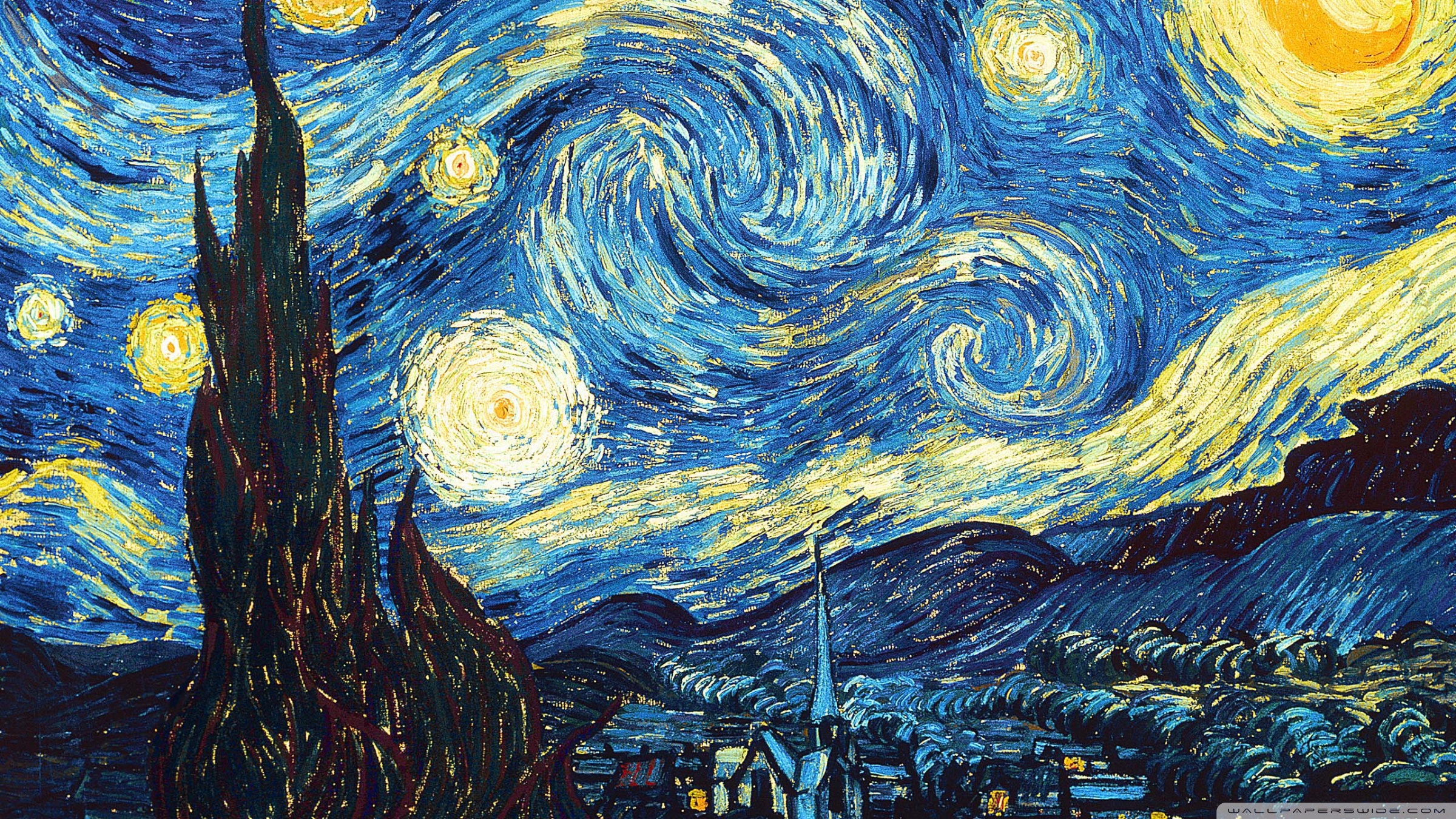 Description: A painting of a starry night with a building in the foreground and a church in the background.