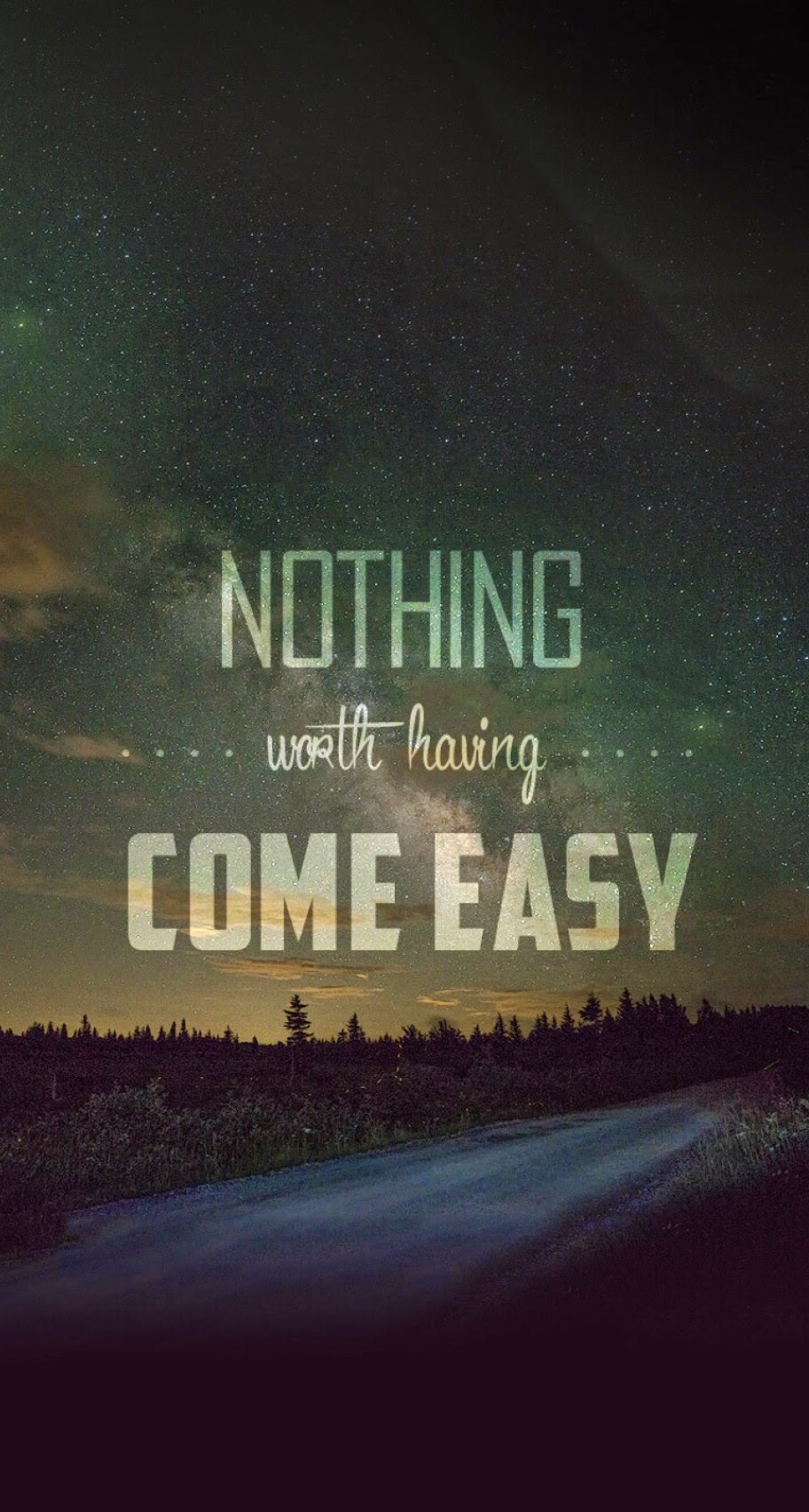 Description: A road with a sky full of stars and the words nothing worth having come easy on it's side.