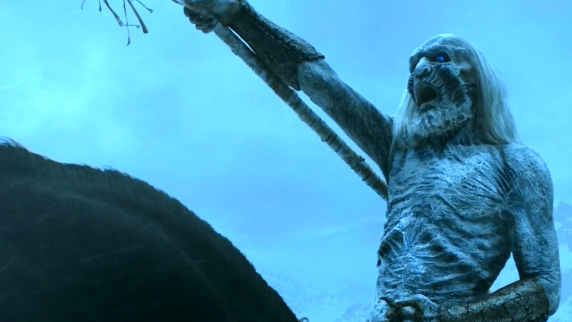 Description: A statue of a man with long hair and a beard holding a tree branch in his hands and looking up.