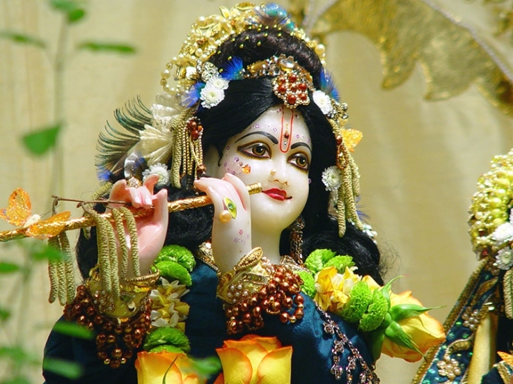 Description: A statue of a woman holding a flute and a flower in her hand and a man in a costume behind her.