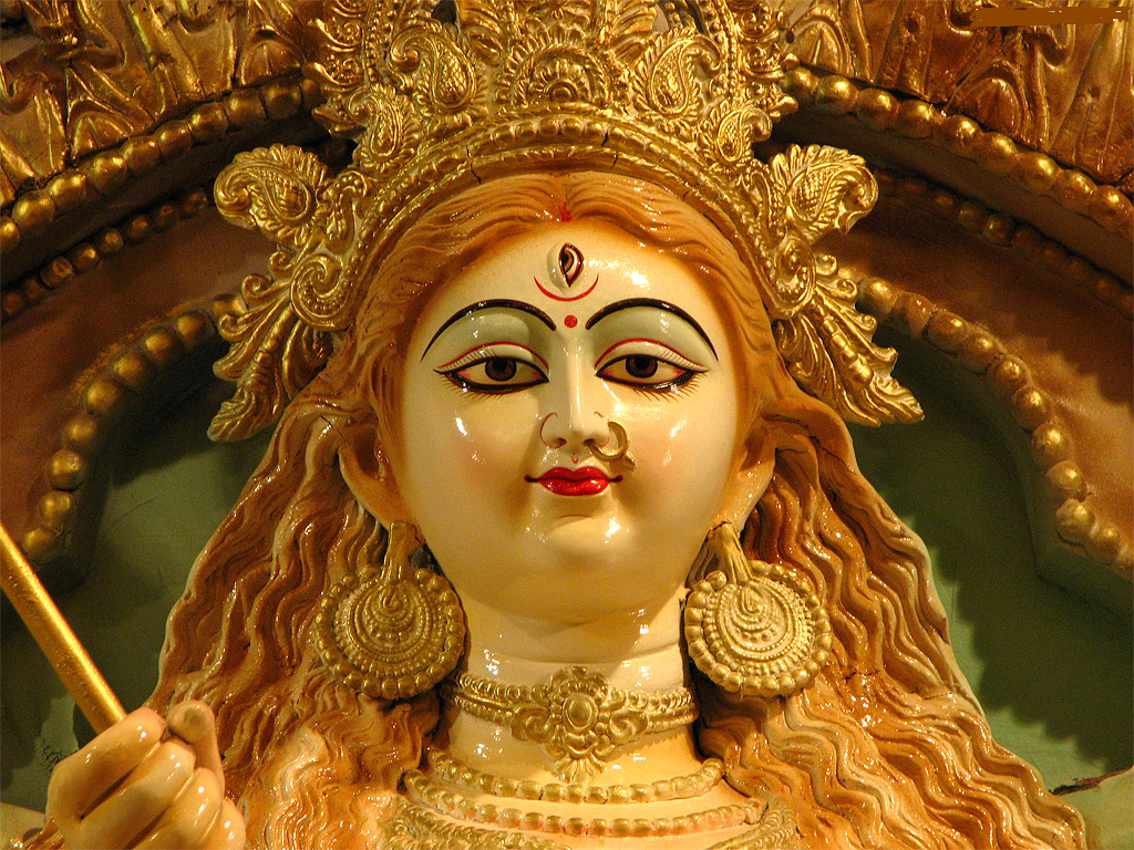 Description: A statue of a woman with a stick in her hand and a green background behind her is a gold frame.