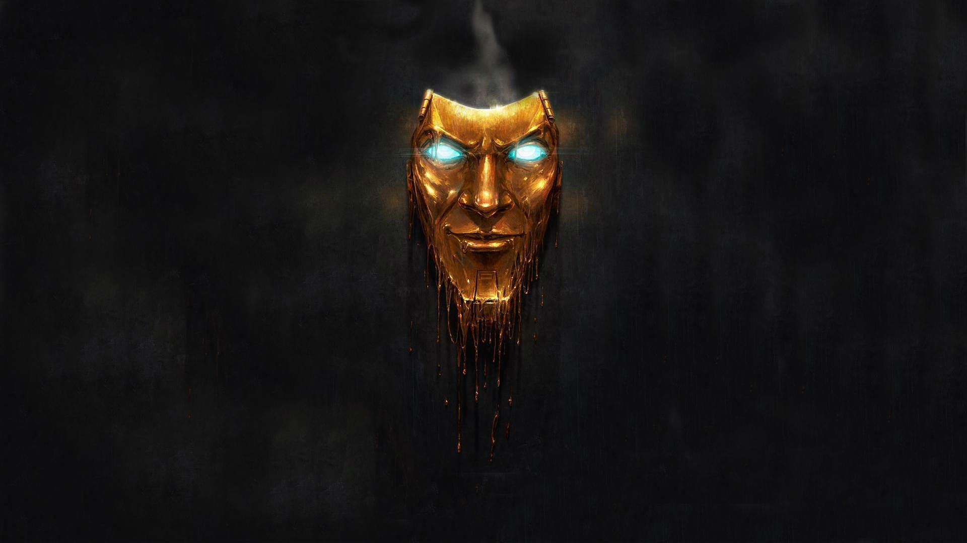 Description: A steampunk mask with glowing eyes and a glowing face is shown in the dark background of a dark room.