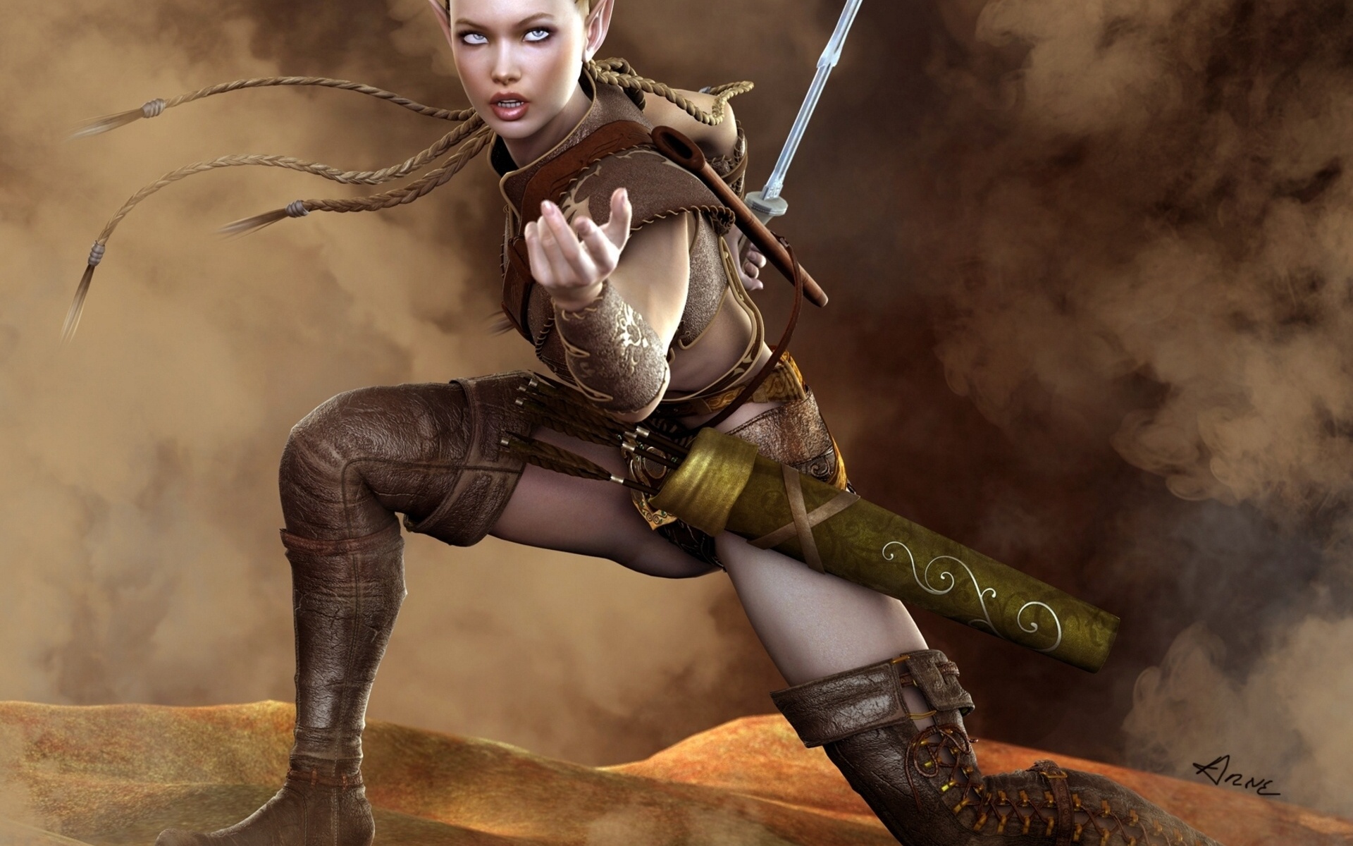 Description: A woman in a steam punk outfit holding a sword and a sword in her hand.