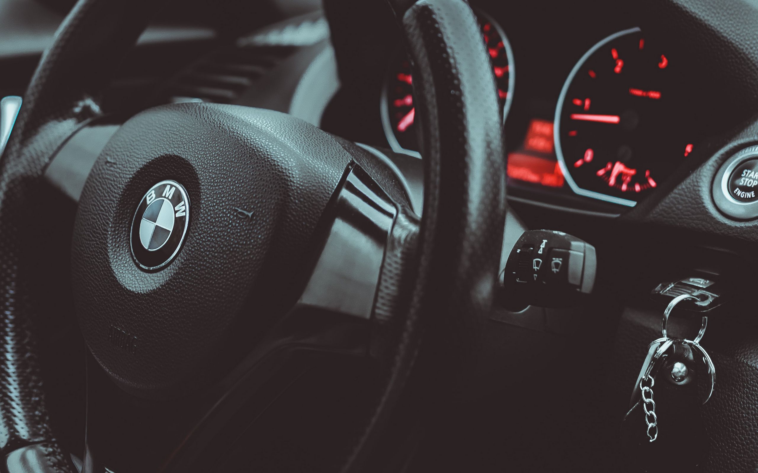 Description: A steering wheel and dashboard of a car with a red light on the dash light and a black leather steering wheel.