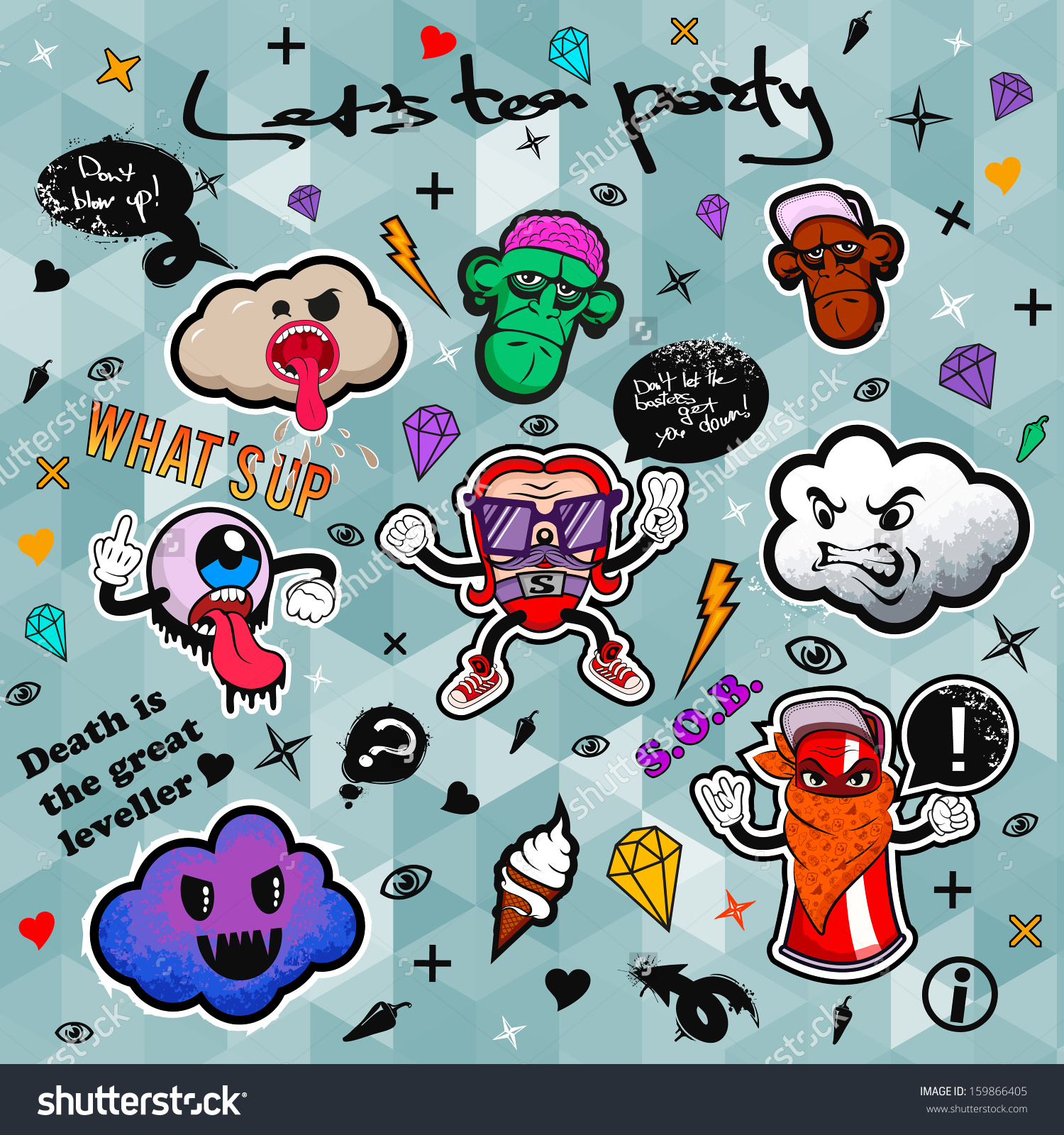 Description: A variety of stickers on a blue background with a pattern of different types of stickers on it.