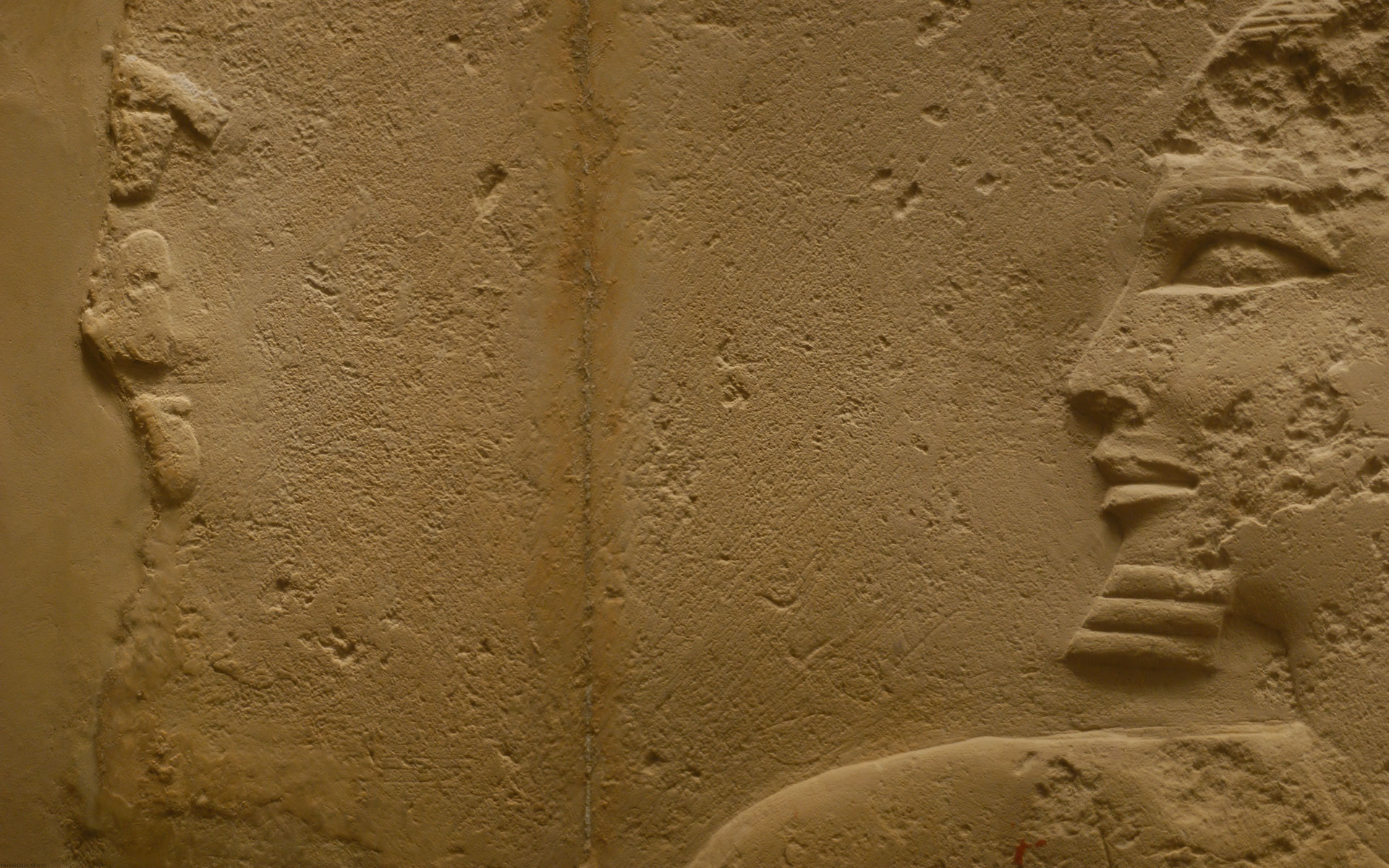 Description: A stone carving of a head and a face on a wall with a red marker in it's left hand.