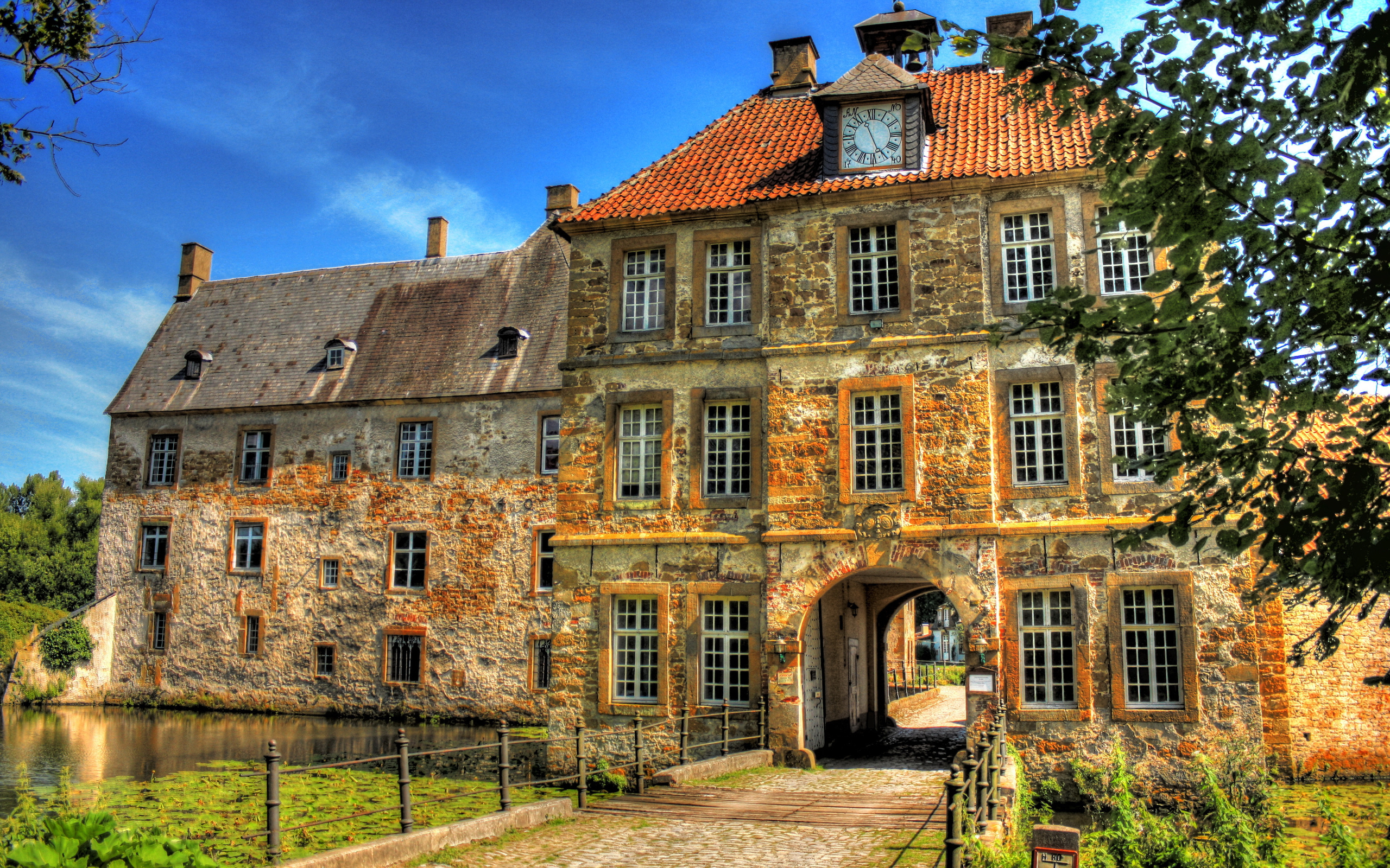 Description: A large stone building with a clock on the top of it's roof and a walkway leading to it.