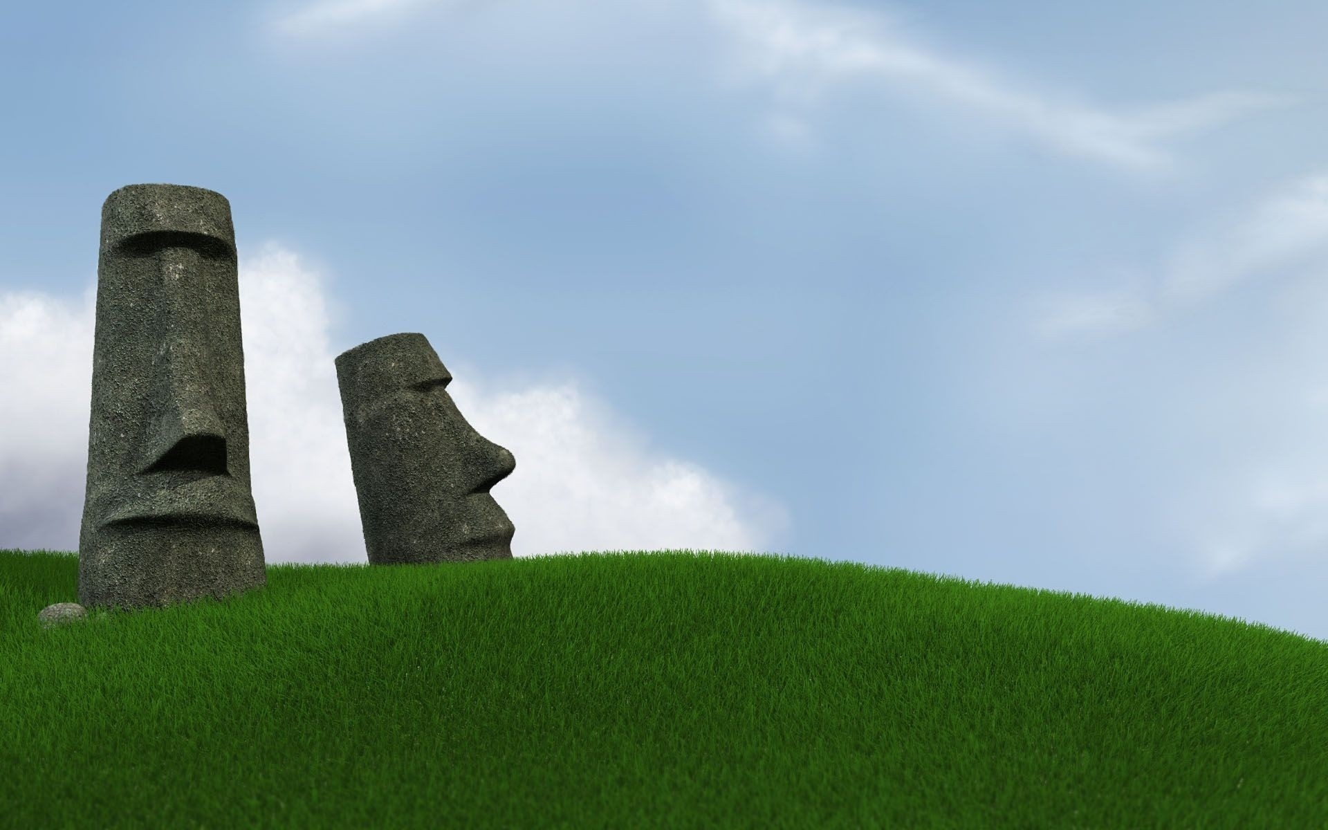 Description: Two stone sculptures on a grassy hill under a blue sky with clouds in the background and a few clouds in the sky.