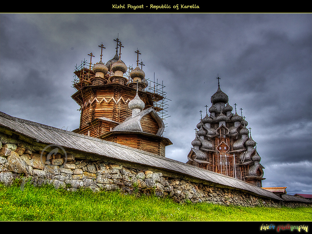 Description: A stone wall with a building with a steeple and a steeple with a cross on it and a cloudy sky.