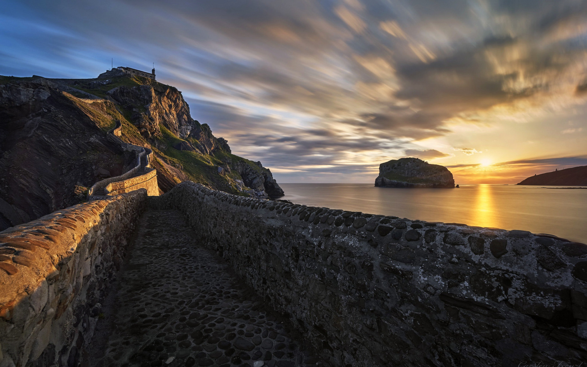 Description: A stone wall with a sunset in the background and a rock outcropping on the side of it.