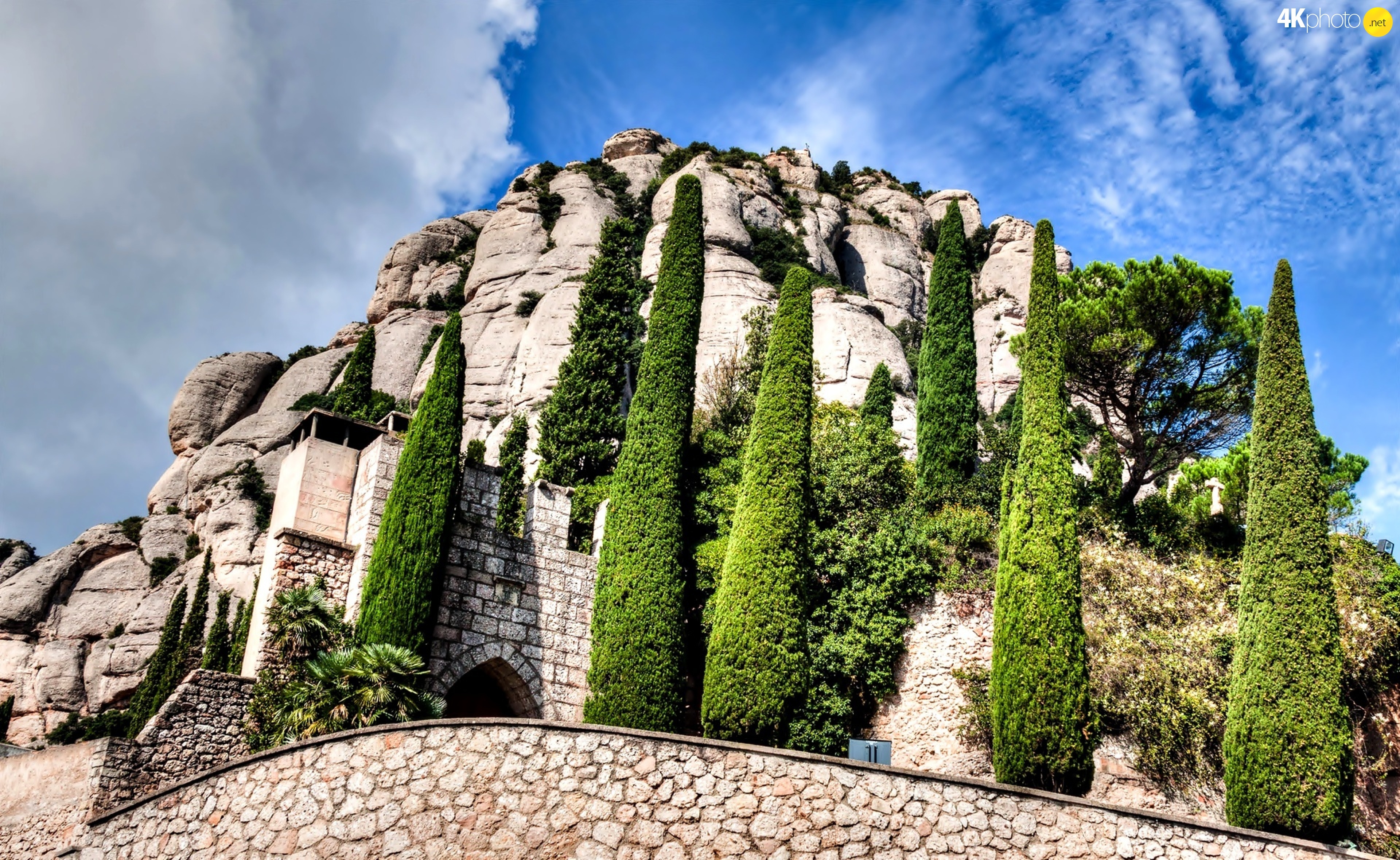 Description: A stone wall with trees growing on it and a blue sky with clouds above it and a stone wall with a stone wall and a stone wall with a stone wall and a.