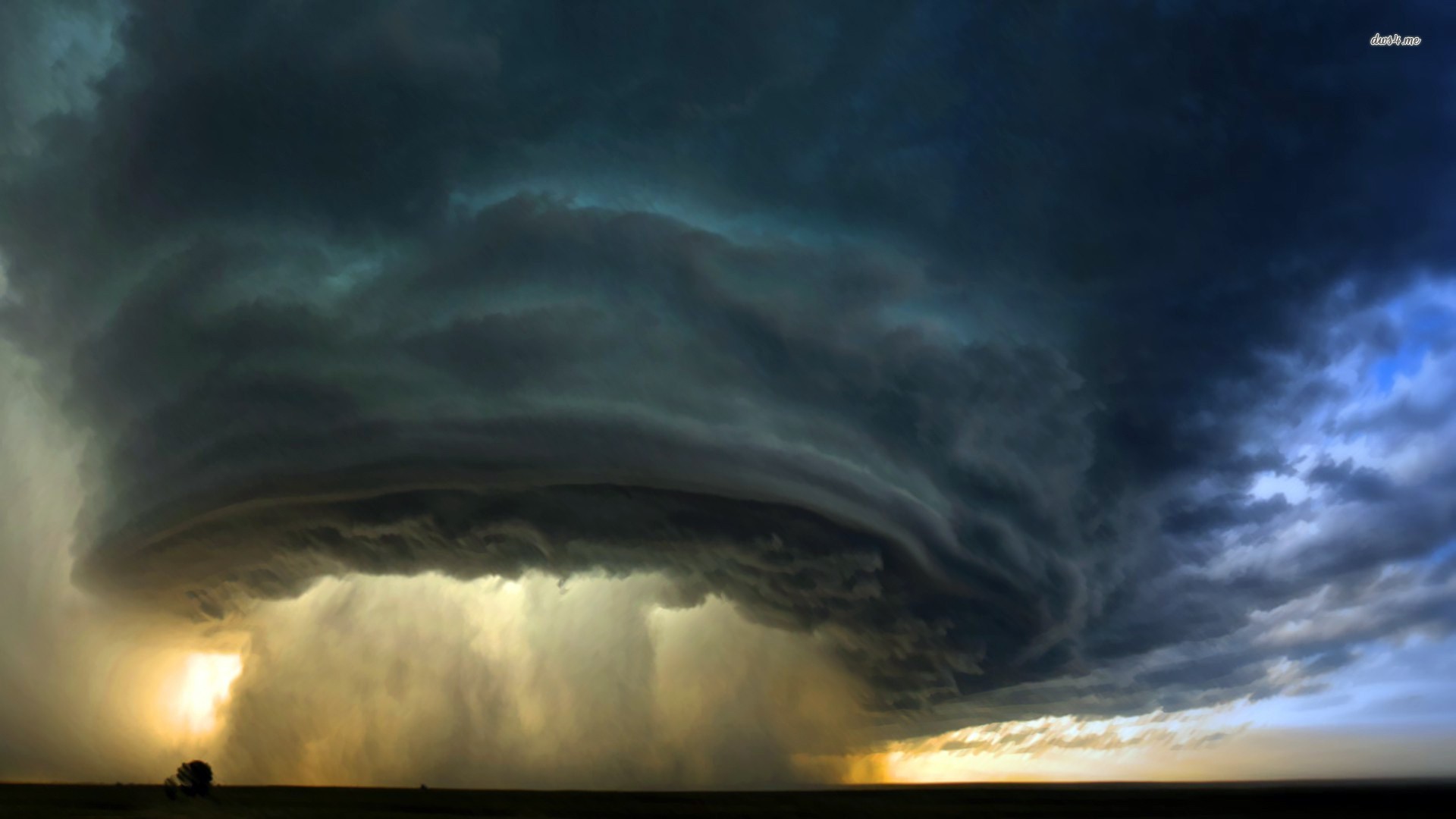 Description: A large storm cloud is seen over a field with a tractor in the foreground and a blue sky with clouds.
