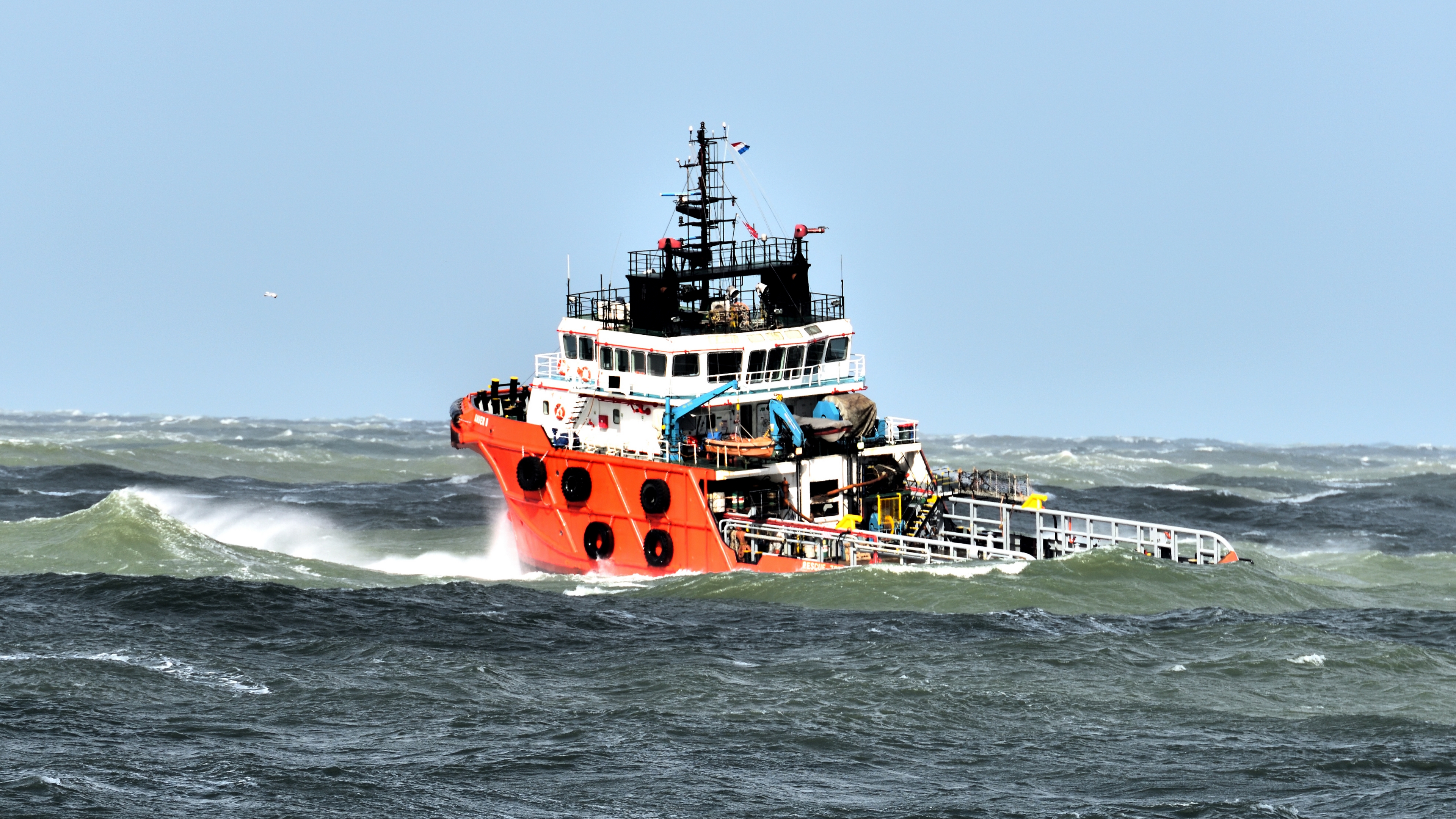 Description: A large boat in the middle of the ocean with a sky background and a few waves around it.
