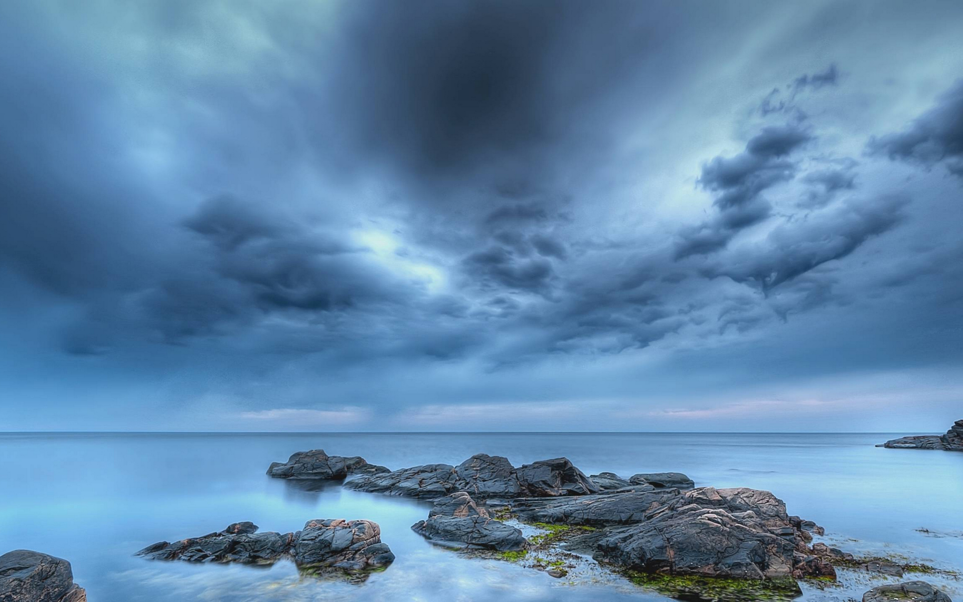 Description: A cloudy sky over a body of water with rocks in the foreground and a few rocks in the foreground.