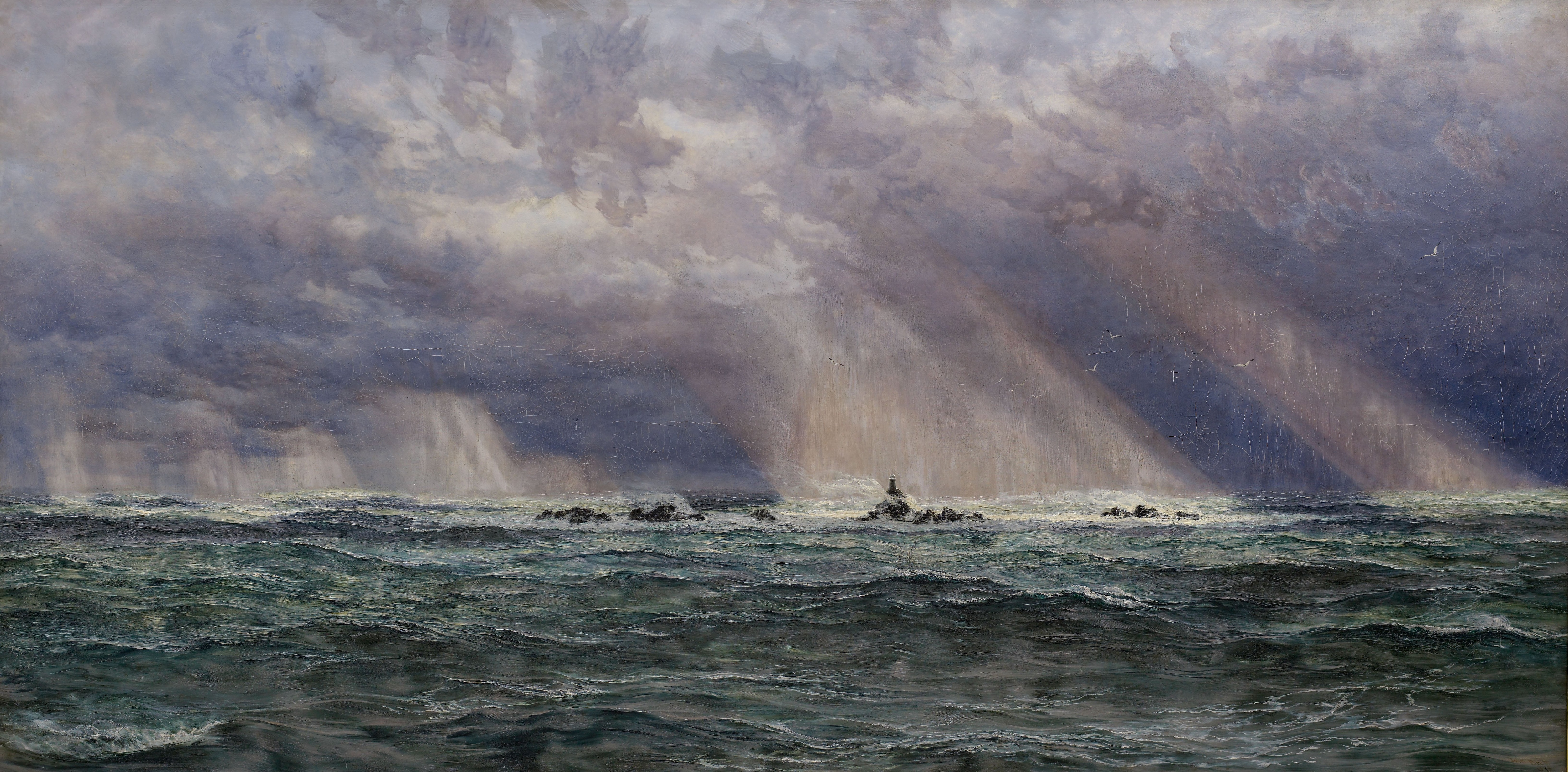 Description: A painting of a boat in a stormy sea with a rainbow in the sky above it and a boat in the water below it.