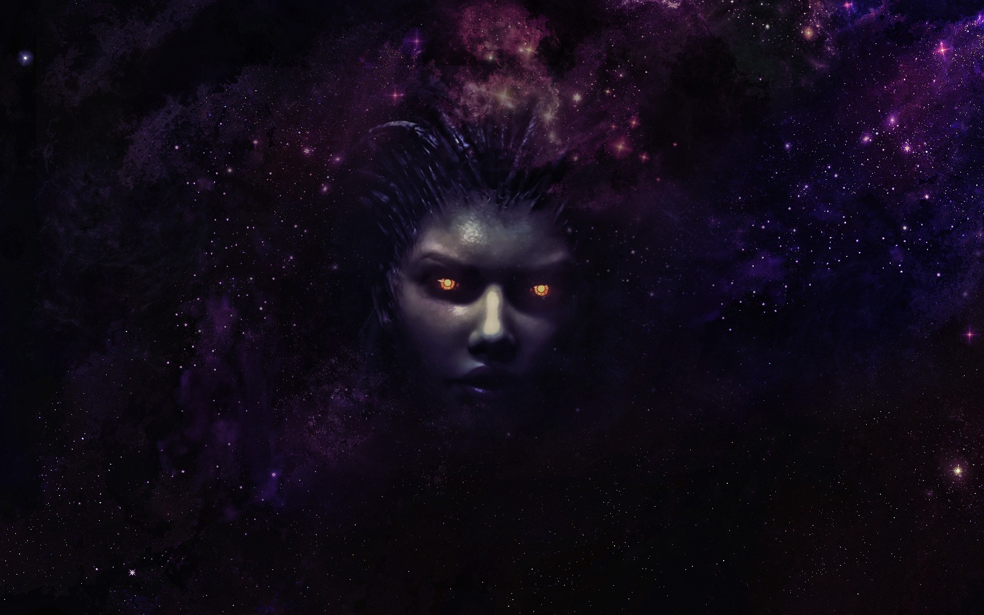 Description: A strange looking creature with a weird face in space with stars in the background and a bright light shining on the face.