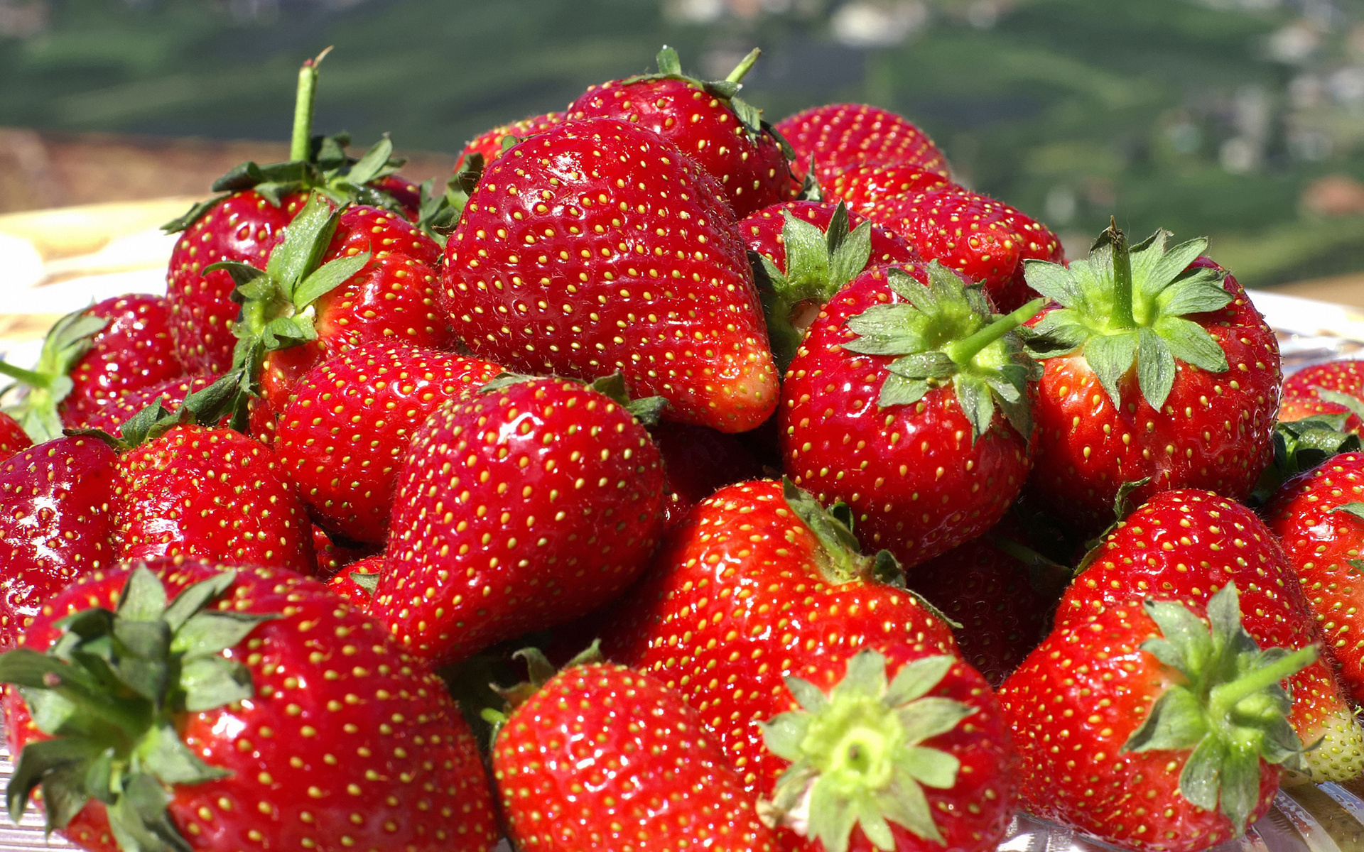 Description: A pile of strawberries sitting on top of a table next to a basket of strawberries on a table.